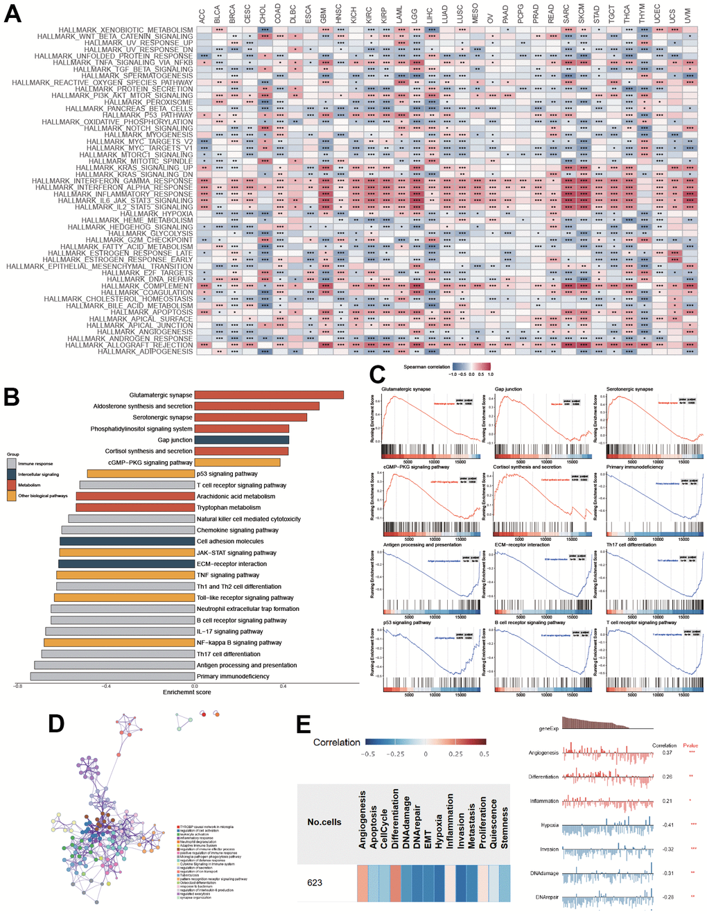 To comprehensively explore the association between PTPN6 and cancer progression, we performed a Spearman correlation analysis between PTPN6 expression and cancer hallmark pathways in each cancer type (Figure 2A). Our functional analysis identified that several cancer hallmarks had been altered, including immune response, intercellular signaling, metabolism, and other biological factor pathways in LGG and GBM (Figure 2B). Additionally, several pathways, including gap junction, glutamatergic synapse, ErbB signaling pathway, serotonergic synapse, cGMP-PKG signaling pathway, and cortisol synthesis and secretion, were significantly up-regulated (Figure 2C, FDR < 0.05). Conversely, antigen processing and presentation, primary immunodeficiency, ECM receptor interaction, Th17 cell differentiation, p53 signaling pathway, and B/T cell receptor signaling pathways were significantly downregulated (Figure 2C, FDR < 0.05). We built a network of enriched GO terms and KEGG pathways of PNPN6 and its related genes based on the clusters and P-values by Metascape in GBM (Figure 2D). Notably, we found that the gene expression of PTPN6 was significantly and positively correlated with angiogenesis, differentiation, and inflammation, while it was negatively associated with hypoxia, invasion, DNA damage, and DNA repair in GBM (Figure 2E, P-value < 0.05).