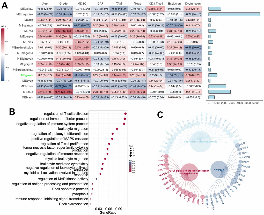 The biological processes analysis revealed that the green module’s genes were enriched by T cell activation, MAPK cascade, leukocyte migration, and proptosis (Figure 3B). The KEGG pathway analysis revealed the genes’ association with T-cell receptor signaling and apoptosis (Figure 3C). These data suggested that genes from the green module may mediate the TME in GBM.
