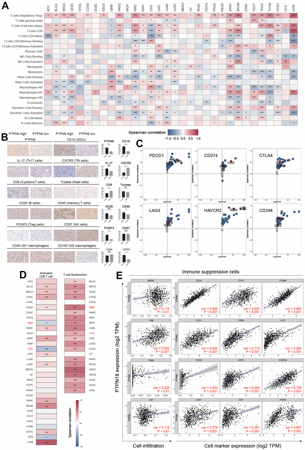 Furthermore, we investigated the correlation between PTPN6 expression and the gene expression of immune checkpoint genes and immunosuppressive cells involved in CD8+ T cell exhaustion. We found that PTPN6 expression was positively correlated with PDCD1, CD274, CTLA4, LAG3, HAVCR2, and CD244 in most cancer types in TCGA, including LGG and GBM (Figure 4C). Additionally, we discovered a significant relationship between PTPN6 gene expressions and microsatellite instability (MSI) and tumor mutation burden (TMB) in several cancer types (Supplementary Figure 4), indicating that PTPN6 may have potential immunogenicity in these cancers. Moreover, we observed a negative correlation between PTPN6 expression and CD8+ T cell infiltration in LGG and GBM (Figure 4D).