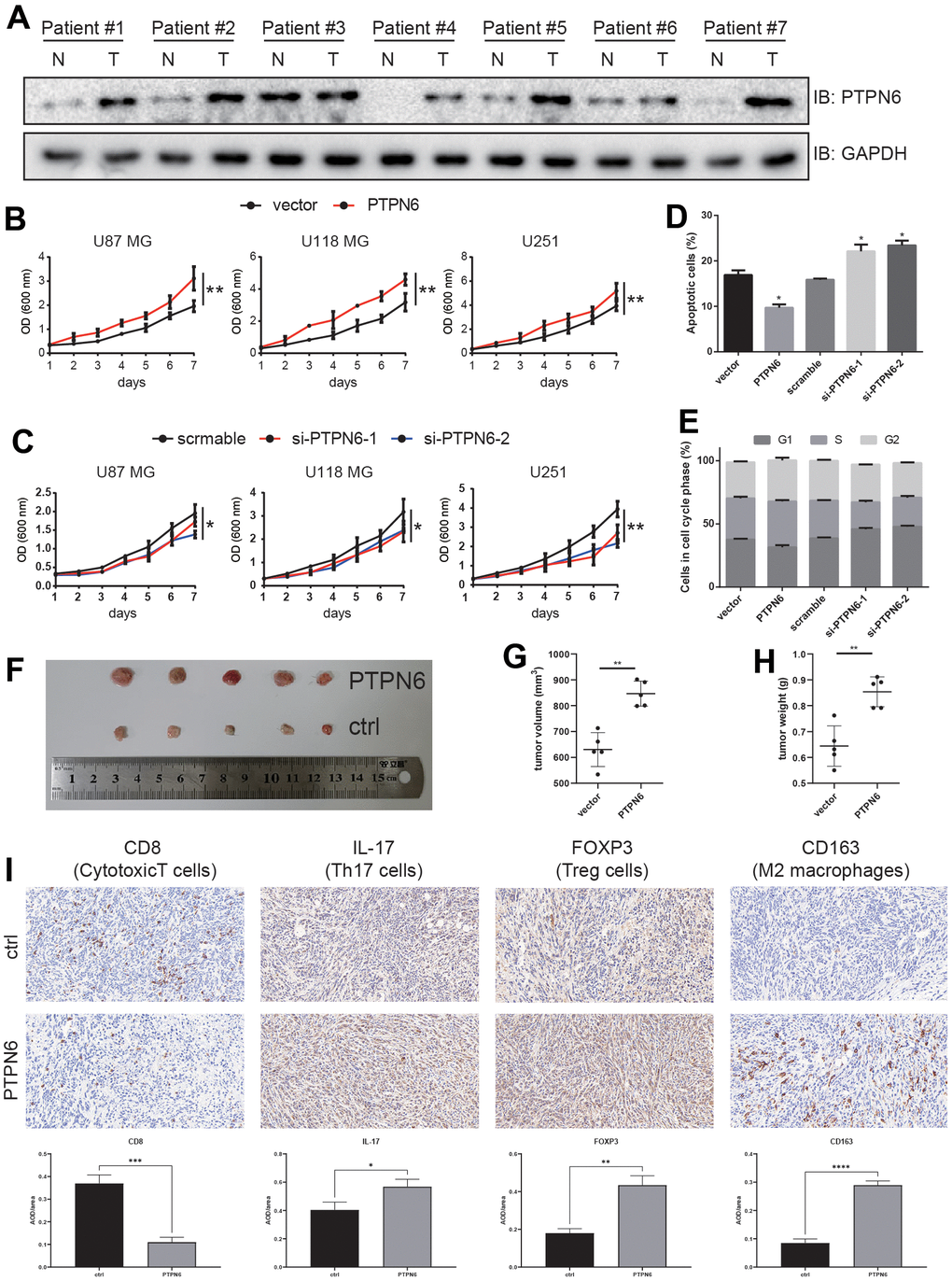 To further elucidate the role of PTPN6 in glioblastoma development, we investigated immune cell infiltration in C57BL/6 mice. Our results demonstrated that mouse glioblastoma cells stably expressing PTPN6 significantly increased tumor development (Figure 6F–6H). Furthermore, we found that PTPN6 blocked the penetration of CD8+ T cells into the tumor lesion while promoting the infiltration of Th17 cells and immunosuppressive cells, such as Tregs and M2 macrophages, into tumors (Figure 6I).