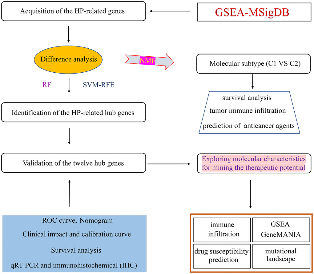 In this study, we developed a unique HP-related tumor classification and performed ML techniques to identify twelve hub genes that may be useful for GC molecular diagnosis and individualized treatment.