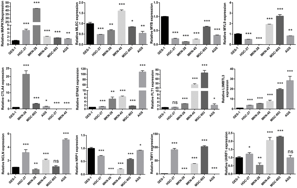 For mRNA expression levels of hub genes, qRT-PCR experiments were conducted in accordance with manufacturers’ instructions and our previous study [29]. A normal gastric epithelial cell line (GES-1) and five human GC cell lines (HGC-27, AGS, MKN-45, MGC803, and MKN-28) were obtained from the Shanghai Cell Bank of the Chinese Academy of Sciences. The glyceraldehyde-3-phosphate dehydrogenase (GAPDH) was treated as internal reference. The 2−ΔΔCq method was adopted to calculate the relative expression levels of hub genes, and GraphPad Prism 6.0 software was utilized to plot bar graphs. Apart from this, the mRNA primer sequences of hub genes were summarized in detail (Supplementary Table 1).