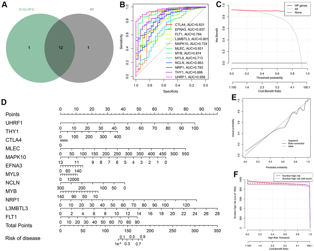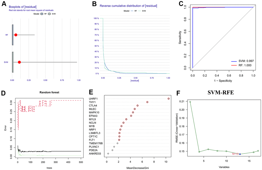 To determine the most critical HP-related genes, two ML methods, SVM-RFE together with RF, were employed to identify the HP-associated hub genes. SVM-RFE, a quite well-established ML algorithm for classification, can achieve the selection of optimal features on the basis of the recursive feature elimination [45]. RF is also a supervised non-parametric ML approach, which can be applied to address classification and regression issues, including gene screening and disease diagnosis [46]. Twelve genes were eventually screened and identified as the HP-related hub genes by intersecting of the results of two ML strategies, namely, EFNA3, UHRF1, FLT1, NRP1, CTLA4, L3MBTL3, MAPK10, MLEC, MYL9, THY1, MYB, as well as NCLN, since both the SVM-RFE and RF models presented less residuals and higher ROC values.