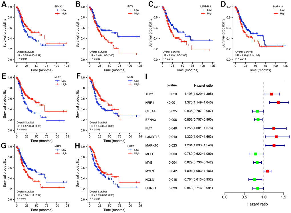 Given that patient prognosis is what counts, we sorted all TCGA-STAD samples into high- or low -expression subgroups according to the median expression of the twelve hub genes for subsequent survival analysis. K-M curves uncovered that only eight hub genes (EFNA3, FLT1, L3MBTL3, MAPK10, MLEC, MYB, NRP1, as well as UHRF1) existed a significant difference in the clinical outcomes of GC patients between high and low-expression subgroups (Figure 5A–5H). However, univariate Cox regression analysis was also conducted to examine the association between the expression levels of hub genes and GC prognosis, and subsequent results revealed that all twelve hub genes were closely related to the survival time and status of patients with GC (Figure 5I). Thus, we could speculate boldly that the twelve HP-related hub genes affected these survival outcomes of GC patients together rather than individually.