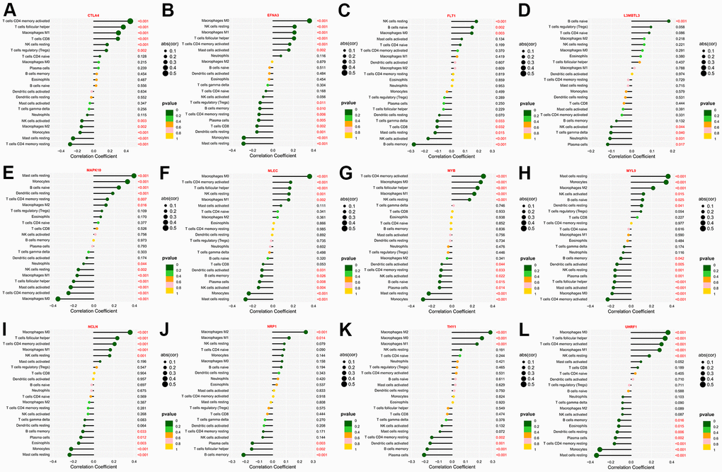 The state of TME profoundly influences the efficacy of immunotherapy [32]. Using the CIBERSORT algorithm, we deconvoluted the composition ratio of distinct immune cell subpopulations in the TCGA- STAD patients. Subsequently, Spearman’s correlation analysis was conducted to discover the relationship between the expression levels of the twelve genes and the degree of immune cell infiltration. Expression of CTLA4 and MYB were negatively correlated with the infiltration abundance of Monocytes, Mast cells resting, as well as T cells CD4 memory resting, while presenting the highest positive correlation coefficient with T cells CD4 memory activated (Figure 6A, 6G). The expression of FLT1 was positively correlated with NK cells resting and B cells naive and negatively correlated with NK cells activated and B cells memory, while the expression level of L3MBTL3 was positively correlated with B cells naïve and Tregs and negatively correlated with Neutrophils and Plasma cells (Figure 6C, 6D). Similarly, NRP1 and THY1 were positively related to Macrophages M2 and Macrophages M1, whereas inversely related to B cells memory and Plasma cells (Figure 6J, 6K). Of interest, EFNA3, MLEC, NCLN together with UHRF1 all exhibited the highest positive correlation with Macrophages M0, and the most significant negative correlation with Mast cells resting (Figure 6B, 6F, 6I, 6L). Besides that, the expression levels of both MAPK10 and MYL9 were positively correlated with Mast cells resting, Monocytes, and B cells naive, but negatively correlated with T cells CD4 memory activated as well as Macrophages M0 (Figure 6E, 6H). Taken together, the hub genes could reshape the immune microenvironment to facilitate the initiation and progression of GC by altering the degree of various immune cell infiltration.