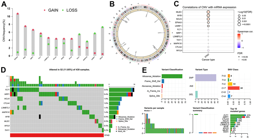 As it is well-known, tumor mutation burden (TMB) has been increasingly recognized as being significantly associated with patient prognosis and immunotherapy response [33–35]. By exploiting the genomic alteration data from the TCGA database, the copy number variant (CNV) and single-nucleotide variant (SNV) events of the twelve hub genes were investigated to explore the relationship between expression and genetic mutation. EFNA3 exhibited the highest frequency of CNV, observed in exceeding 10% of TCGA-STAD samples, with CNV Gain being the more prevalent type compared to CNV Loss (Figure 7A). At the same time, the CNV frequencies over 3% for all hub genes were also found (Figure 7A). As displayed in Figure 7B, the chromosomal region and CNV state of all twelve genes were carefully marked on the schematic diagram. Further analysis suggested that the mRNA expression levels of MLEC, MYB, NCLN, EFNA3, and UHRF1 were positively related to their CNV frequencies (Figure 7C). Of the 439 GC samples, 52 (11.85%) occurred the alteration of hub genes, and FLT1 presented the highest SNV frequency (3.6%), followed by NRP1 (3.4%), NCLN (1.8%) (Figure 7D). Alongside this, subsequent results indicated that missense mutation (>60%), single-nucleotide polymorphism (SNP) (>60%), as well as C > T (34) were the most frequent classifications of SNV (Figure 7E).