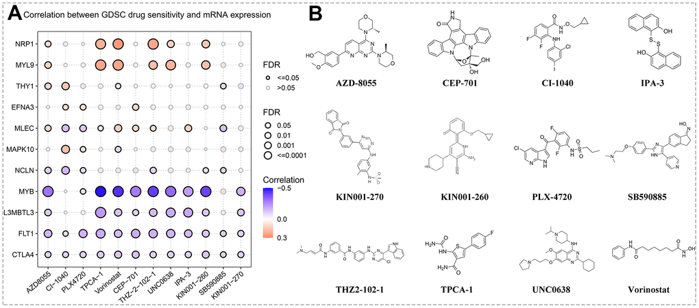 By logging in to the Gene Set Cancer Analysis (GSCA) (http://bioinfo.life.hust.edu.cn/GSCA/#/drug) database, the association between the sensitivity of drugs derived from the Genomics of Drug Sensitivity in Cancer (GDSC) database and the mRNA expression of hub genes was explored [28]. At the same time, the chemical structural formulas of GDSC agents that exhibited a significant positive or negative correlation with the expression of these hub genes were collected by querying the MedChemExpress website (https://www.medchemexpress.cn/).