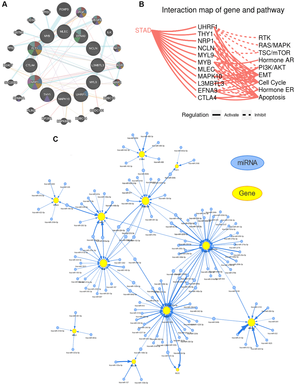 The synergy among hub genes was fully reflected in the above content. Therefore, to confirm the degree of tight junction of these hub genes, a PPI network was construed by using the GeneMANIA website (Figure 9A). To further examine the role of these hub genes in the occurrence and development of GC, the GSCALite database was utilized to investigate the interaction between hub genes and cancer-related pathways. The interaction maps uncovered that almost all hub genes were involved in the cancer-associated pathways, comprising RAS/MAPK, epithelial–mesenchymal transition (EMT), TSC/mTOR, receptor tyrosine kinase (RTK) signaling, hormone AR signaling, cell cycle, PI3K/AKT, hormone ER signaling, as well as apoptosis (Figure 9B). The upstream miRNAs is essential for understanding the oncogenic or tumor suppressor mechanism of gene, and a miRNA-mRNA regulatory network for hub genes was also created by using the GSCALite database, indicating that these hub genes shared common miRNAs to participate in various biological behavior of GC (Figure 9C). Furthermore, we again split TCGA-STAD samples into two subgroups (high- or low- expression) in accordance with the median expression of these hub genes for performing the GSEA analysis (Supplementary Figure 7). GSEA results showed that CTLA4, L3MBTL3, MAPK10, MLEC, MYB, MYL9, NCLN, NRP1, THY1, and UHRF1 were mainly enriched in pathways correlated with pathways in cancer, cell cycle, DNA replication, ECM-receptor interaction, cell adhesion molecules (CAMs), bladder cancer, renal cell carcinoma, focal adhesion, natural killer cell mediated cytotoxicity, T cell receptor signaling pathway, spliceosome, calcium signaling pathway, base excision repair, purine metabolism, pyrimidine metabolism, chemokine signaling pathway, mTOR signaling pathway, N-glycan biosynthesis, in the high-expression subgroup, whereas EFNA3 and FLT1 were involved in the calcium signaling pathway, ribosome, oxidative phosphorylation, hematopoietic cell lineage, Parkinsons disease, and vascular smooth muscle contraction in the low-expression subgroup.