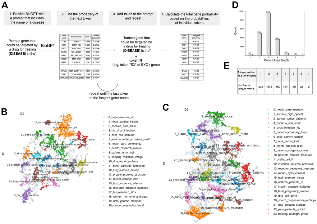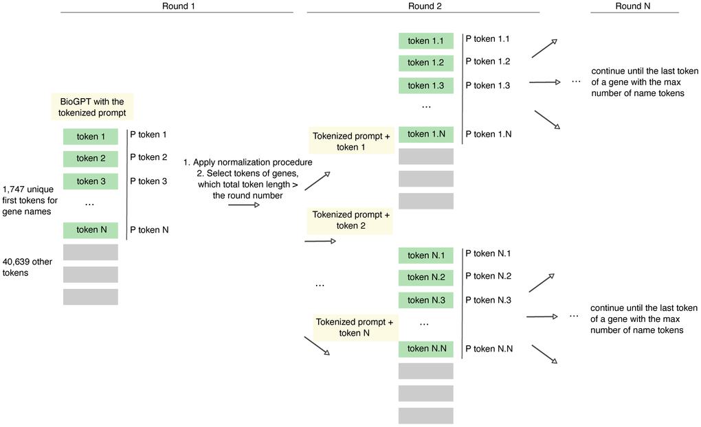 One of the major parts of the pipeline development was to establish the procedure for the gene name probability estimation. We utilized the general tokenizer provided by Microsoft for BioGPT that contains only a part of the gene's names in the vocabulary. Thus, most of the genes are coded with 2 to 7 tokens, while only less than 2% of the genes are directly found in the vocabulary (Figure 1D, 1E). Thus, to estimate the probability of the gene name with several tokens, the tokens were iteratively added to the initial prompt for the calculation of the next token probability (Figure 2). The total probability of the gene was calculated as the multiplication of its tokens probabilities.