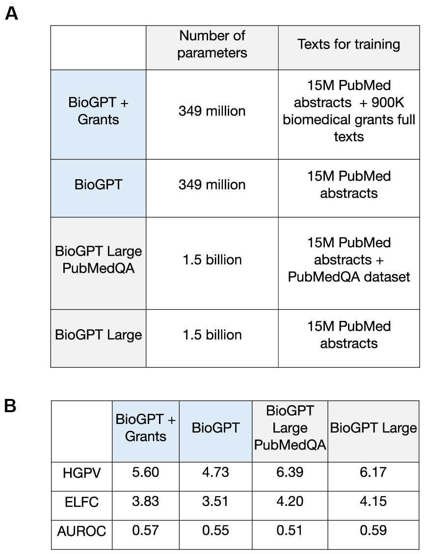 The established pipeline was used to estimate the performance of several modifications of BioGPT models to check if the training with additional data could improve the task-specific performance. Our main focus was on the initial BioGPT and the one trained with grants (BioGPT-G), but we also included two versions of BioGPT Large with increased parameter size: the basic one and the one trained with PubMedQA dataset (Figure 4A). Based on the validation metrics, training with additional relevant data promotes an increase in performance in target discovery tasks (Figure 4B). It was observed for both grants information and PubMedQA dataset. The general increase of BioGPT Large performance could be connected with the high parameters number.