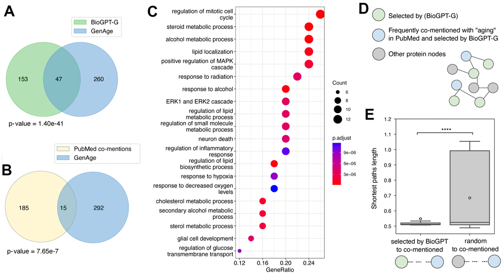 We next used a proposed approach for information retrieval with BioGPT-G to rank genes according to their association with aging. The top 200 entries (Supplementary Table 1) were selected for further investigation. Initially, we checked the intersection of this list with known age-related genes obtained from the GenAge database [24]. We have observed a significant overlap with 47 out of 200 genes appearing to have a known association with aging (p < 0.001; Figure 5A). For the comparison, we retrieved the genes that are most commonly mentioned in the context of aging in PubMed though calculating the number of abstracts with the co-occurrence of the selected gene name and “aging”. Their intersection with the GenAge database comprised 15 genes (p < 0.001; Figure 5B). Additionally, we also performed Gene Ontology (GO) enrichment analysis for the top 50 genes ranked by BioGPT-G and observed the significant results (FDR adjusted p < 0.01) for 575 categories (Figure 5C and Supplementary Table 2). Notably, most of the top ranked categories express the evidence for the association with aging. Specifically, cellular processes related to metabolism, stress response, and kinase cascades are described as age-related in recent publications [25–27]. Altogether, the results suggest that the usage of LLMs could be more efficient in context-specific tasks compared with the traditional target discovery methods.
