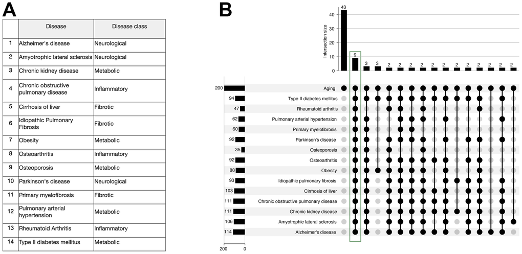 For target identification in age-related diseases, a list of 14 previously published diseases according to the study of Pun et al. [28] was extracted. These diseases were selected based on their characteristics of having age as a strong risk factor for the disease’s onset.