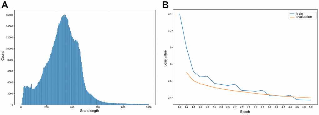To enrich the biomedical knowledge base of the chosen BioGPT model, we additionally pretrained it on more than 900 thousand grant abstracts by optimizing the same objective as for GPT-2 [69]. The pre-training lasted for around 40 hours with a train batch size of 16 and gradient accumulation steps of 64 per device on four A5000 GPUs. For the optimization, we used Adam algorithm [70] with 100 warm-up steps and learning rate 5e-5. The original BioGPT tokenizer was used with the max length of input texts equal to 250 tokens with truncation, the distribution of input text lengths depicted in Figure 7A. We filtered out abstracts with less than 8 words total assuming that they don’t carry useful information.
