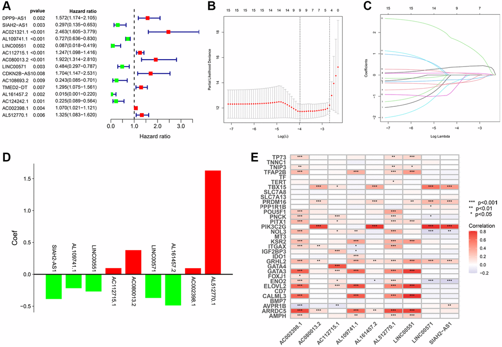 The univariate Cox analysis revealed that 15 of 648 TLRs were significantly related to overall survival (OS) (Figure 2A). In the training cohort, the aforementioned genes were subjected to the least absolute shrinkage and selection operator (LASSO) regression analysis for dimensionality reduction. There was a total of nine TRLs that were filtered out and used to create a prognostic signature (Figure 2B, 2C). The coefficient distributions of nine TRLs are illustrated in Figure 2D. The risk score for each KIRC patient can be estimated: risk score = (−0.387 × value of SIAH2-AS1) + (−0.218 × value of AL109741.1) + (−0.269 × value of LINC00551) + (0.097 × value of AC112715.1) + (0.379 × value of AC080013.2) + (−0.370 × value of LINC00571) + (−0.488 × value of AL161457.2) + (0.096 × value of AC002398.1) + (1.627 × value of AL512770.1). Additionally, we conducted a co-expression analysis of TRLs and telomere-related genes, and the results indicated that AC002398.1 and AL512770.1 co-expressed more than any other TRLs and telomere-related genes, which were linked to a poor prognosis (Figure 2E).