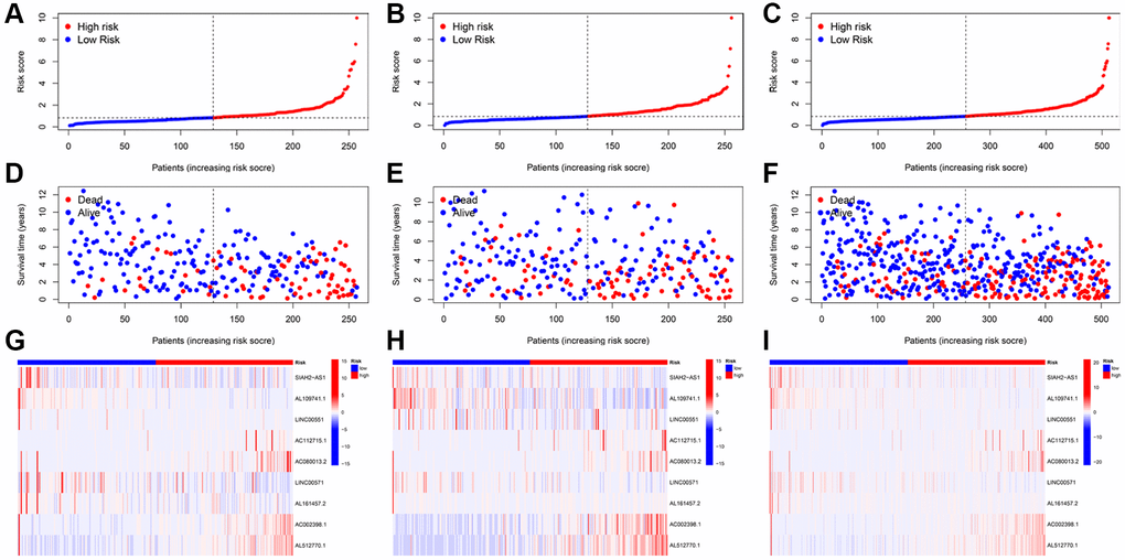 KIRC patients were separated into low- and high-risk groups using the median score. Subsequently, we ranked the KIRC patients based on their risk scores from the training, testing, and entire cohorts (Figure 3A–3C). We then compared the patient survival status and the expressions of nine TRLs between two groups in the training, testing, and entire groups, respectively. We found that as the risk score increases, the number of deaths among patients with KIRC increased (Figure 3D–3F). Furthermore, four deleterious lncRNAs (AC112715.1, AC080013.2, AC002398.1, and AL512770.1) exhibited relatively high expression in the high-risk group, whereas five protective lncRNAs (SIAH2-AS1, AL109741.1, LINC00551, LINC00571, and AL161457.2) demonstrated the opposite trend (Figure 3G–3I).