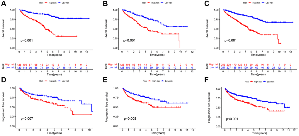 The survival analysis revealed that the high-risk group suffered a significantly shorter OS rate than the low-risk group (Figure 4A–4C). In addition, there was a significant difference in PFS between the two groups, with the progression-free survival (PFS) rate being higher in the low-risk group (Figure 4D–4F). Except for stage N1, significant statistical differences in survival analysis were observed between KIRC patients with distinct clinical features (Supplementary Figure 2). The absence of a significant difference in the OS rate may be partially explained by the fact that there are fewer cases of N1 group. In addition, we found that patients with high-grade and advanced-stage tumors had significantly higher risk scorers than those with low-grade and early stages tumors (Supplementary Figure 3). Between these two groups, there was no significant difference in the distribution of age and gender. The preceding result revealed that the constructed prognostic signature holds for almost all clinical features of KIRC patients.