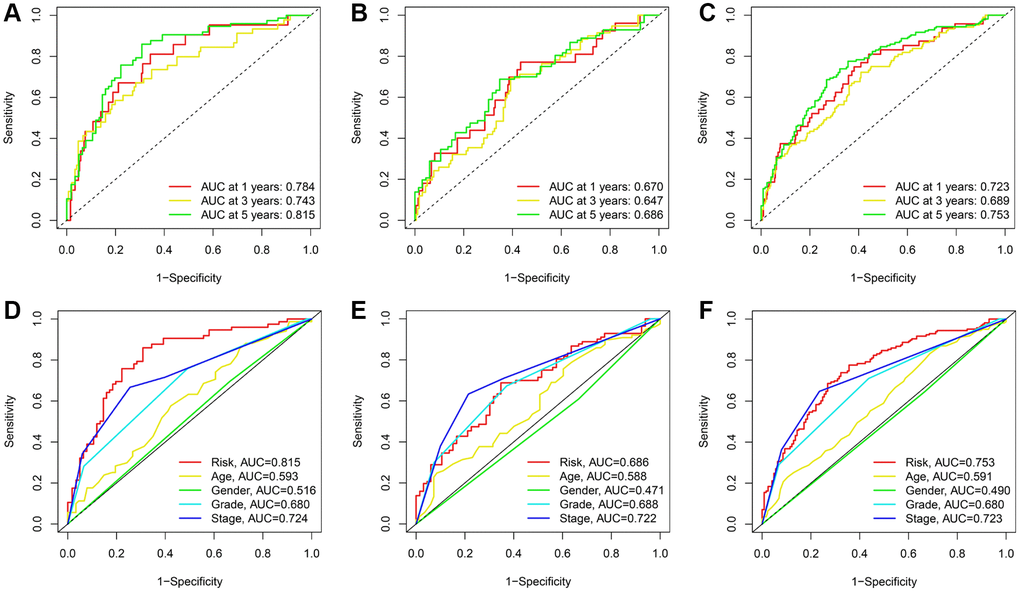 The predictive efficacy of the signature was further evaluated using the area under the curve (AUC) and its values for 1, 3, and 5 years were 0.673, 0.743, and 0.893, respectively (Figure 5A). Comparatively, the maximum AUCs for the testing cohort and the entire cohort were 0.686 and 0.753, respectively (Figure 5B, 5C). In addition, we observed that the risk score predicted the prognosis of KIRC patients better than other clinical variables (Figure 5D–5F).