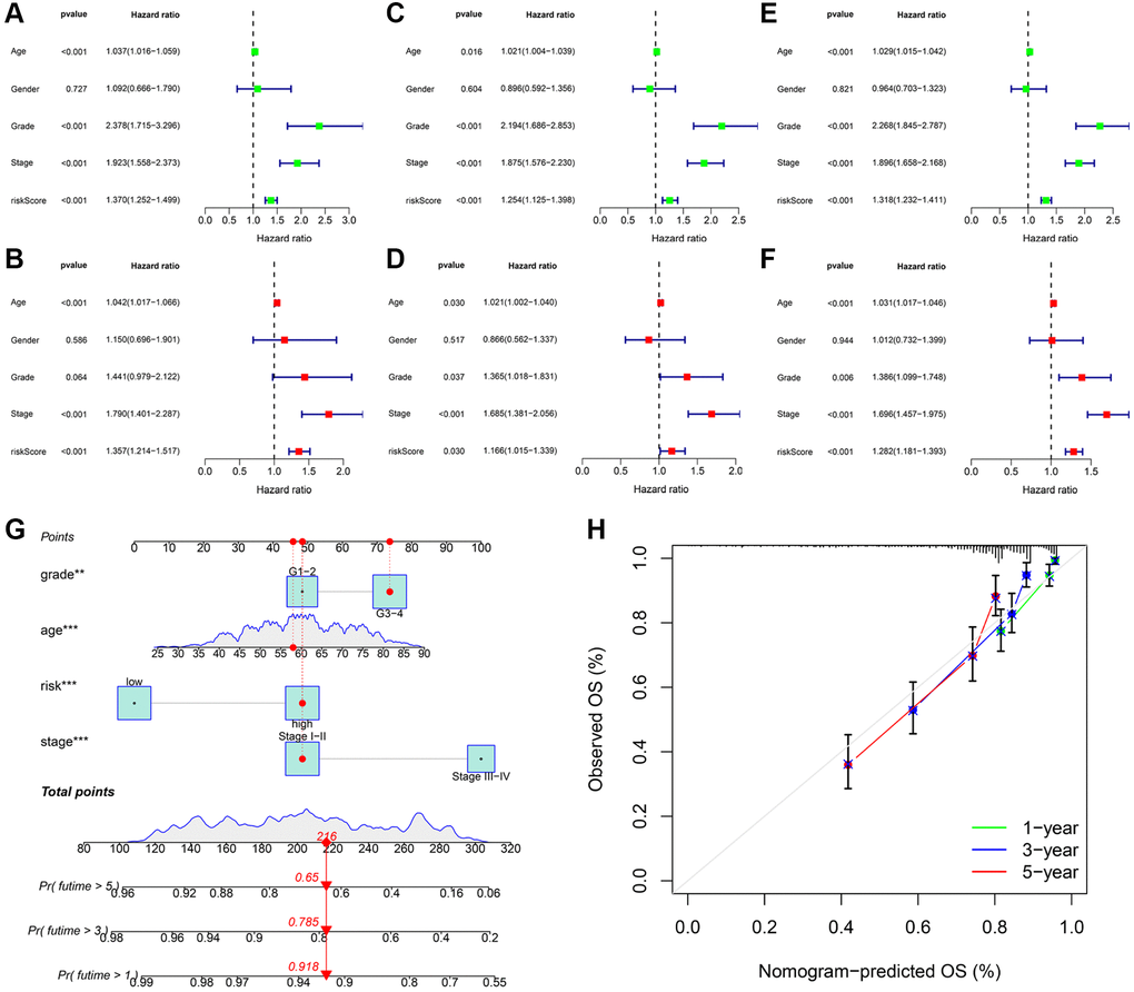 We utilized univariate and multivariate Cox analyses of variables to determine if the signature-based risk score was an independent prognostic factor for OS, independent of other clinical characteristics. In the training cohort, univariate Cox analysis revealed a significant association between risk score and patient survival (Figure 6A). In addition, a multivariate Cox analysis implied that the risk score was an independent prognostic factor (Figure 6B). The results of independent prognostic analysis for the testing (Figure 6C, 6D) the entire cohorts (Figure 6E, 6F) were identical. Accordingly, these findings suggested that the signature-based risk score was an independent prognostic factor for OS, suggesting which had a certain clinical utility for the prognosis evaluation. Subsequently, we developed a nomogram by integrating three independent indicators (age, grade, and stage) and a risk score to predict the 1, 3, and 5-years OS of KIRC patients (Figure 6G). The calibration curves validated the consistency of the nomogram (Figure 6H).