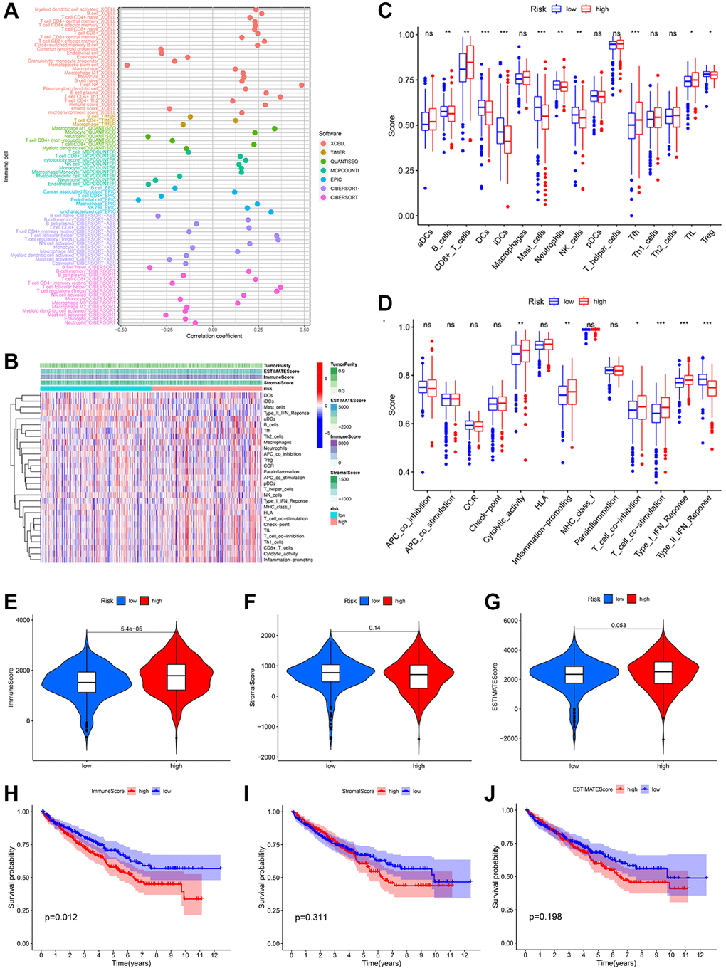 Since the preceding results indicated a close association between risk scores and immune functions, we investigated the immune profiles of KIRC patients in low- and high-risk groups. A significant correlation between various immunocytes and the risk score was observed, which was determined by employing seven algorithms to study the relationship between risk score and tumor immune cell infiltration (Figure 7A). Then, using the single sample Gene Set Enrichment Analysis (ssGSEA) algorithm, we quantified scores for immune cell enrichment and function enrichment (Figure 7B). The proportions of CD8+ T cells, T follicular helper cell and tumor Infiltrating lymphocytes were higher in the high-risk group than the low-risk group (Figure 7C). As for the immunization-associated function enrichment scores, cytolytic activity, inflammation promoting, T cell co-inhibition/stimulation, and IFN response (Type 1) were higher in the high-risk group than the low-risk group (Figure 7D). We then determined that the immune score of the high-risk group was obviously higher than the low-risk group using the ESTIMATE algorithm (Figure 7E). Neither the stromal score nor the estimated score varied significantly between subgroups (Figure 7F, 7G). In addition, the poor prognosis was more prevalent among KIRC patients with higher immune scores (Figure 7H), indicating that the immune score can be used to predict the outcomes of these patients. However, there was no significant survival difference in the stromal score and estimate score (Figure 7I, 7J).