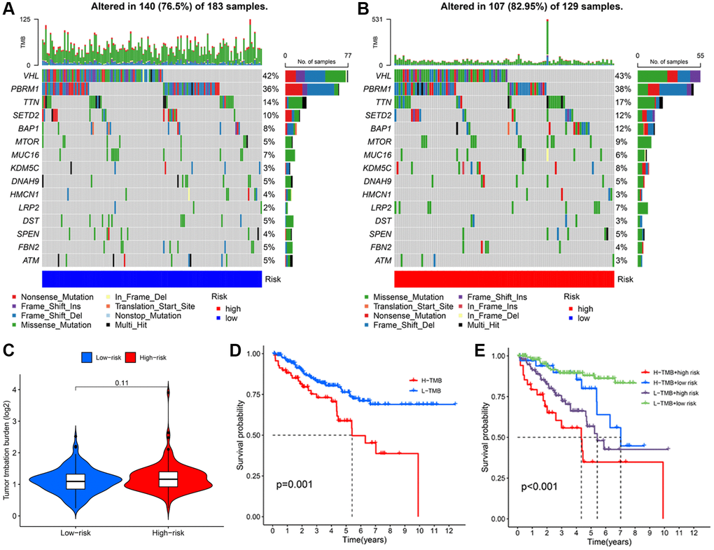 TMB levels are increasingly regarded as a sensitive predictor of the clinical response to immunotherapy in multiple cancers [34]. We analyzed somatic mutations to explore the role of TMB in KIRC. A total of 247 patients possessed somatic mutations, 107 (76.50%) in the low-risk group and 140 (85.95%) in the high-risk group. Similarly, to other studies, the VHL genes exhibited the highest frequency of mutations. In addition, we discovered that the high TMB group suffered poor survival rates, although there was no difference between TMB and risk score. This phenomenon was also identified in a separate study [35].