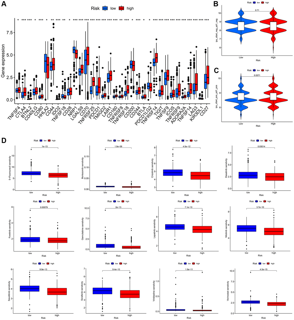 We also compared the expression levels of several ICIs genes between low- and high-risk groups and then utilized the TCIA database to predict potential immunotherapy responses [43]. Gene expression profiles and drug response data were obtained from the Genomics of Drug Sensitivity in Cancer (GDSC) database. Additionally, we adopted ridge regression to predict the IC50 of drugs with the “oncoPredict” package [44]. The IC50 was calculated as tolerance ability, and a higher IC50 indicated the cells showing higher resistance to drugs. The difference in sensitivity score was then analyzed between the two groups.