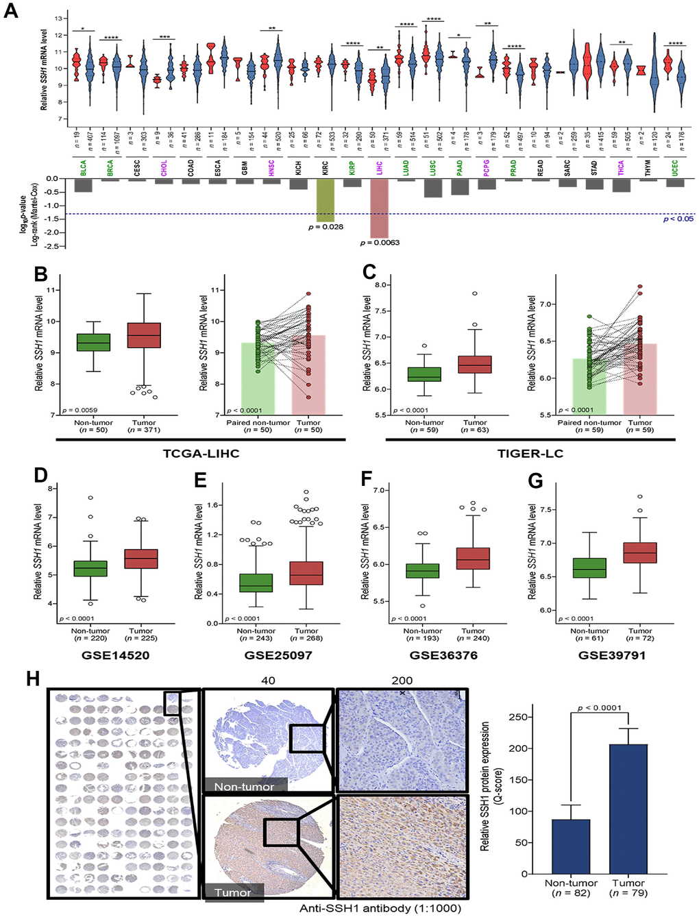 Our analysis of the expression of SSH1 mRNA levels in tumor and non-tumor samples from patients with one of 23 cancer types contained in The Cancer Genome Atlas (TCGA) database showed that compared to the non-tumor samples, SSH1 was significantly upregulated in cholangiocarcinoma (CHOL) (p < 0.001), head and neck squamous cell carcinoma (HNSC) (p < 0.01), pheochromocytoma and paraganglioma (PCPG) (p < 0.01), thyroid cancer (THCA) (p < 0.01), and in liver hepatocellular carcinoma (LIHC, n = 421) (p < 0.01) (Figure 1A). More so, the Mantel-Cox test revealed significantly more total number of deaths among patients with higher expression of SSH1 than among their low expression group (p = 0.006) (Figure 1A). Minimizing likely experimental design-based bias, our analysis of paired tumor-non-tumor samples showed that compared to their paired non-tumor counterparts, SSH1 was overexpressed in the tumor samples from the TCGA-LIHC (n = 100; p < 0.0001) and the Thailand Initiative in Genomics and Expression Research for Liver Cancer (TIGER-LC) (n = 118; p < 0.0001) datasets (Figure 1B, 1C). Consistent with the above, we demonstrated similar mRNA expression profile for SHH1 in the GSE14520 (n = 445, p < 0.0001), GSE25097 (n = 511, p < 0.0001), GSE36376 (n = 433, p < 0.0001), and GSE39791 (n = 133, p < 0.0001) HCC datasets (Figure 1D–1G). Immunohistochemistry (IHC) of HCC tissue microarray constituting of paired samples from our HCC cohort confirmed the upregulation of SHH1 in tumor compared to non-tumor at protein level too based on the Q-score (2.36-fold, p < 0.0001) (Figure 1H).
