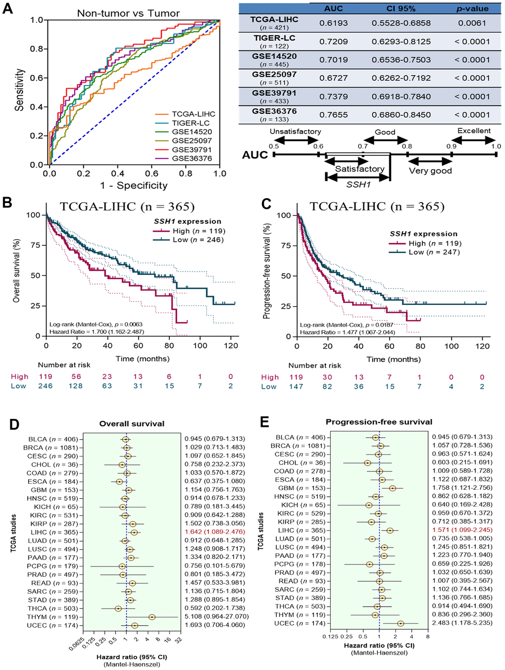 Furthermore, synchronous analysis of TCGA-LIHC (n = 421), TIGER-LC (n = 122), GSE14520 (n = 445), GSE25097 (n = 511), GSE39791 (n = 433), and GSE36376 (n = 133) HCC datasets demonstrated that the expression of SSH1 exhibits the satisfactory or good capability to differentiate non-tumor from tumor cases as expressed by the area under the receiver operating characteristics curves (AUCs) of 0.62 (p = 0.006), 0.72 (p < 0.0001), 0.70 (p < 0.0001), 0.67 (p < 0.0001), 0.74 (p < 0.0001), and 0.77 (p < 0.0001), respectively (Figure 2A). Having shown that SSH1 is significantly upregulated in HCC at mRNA and protein levels, with a suggested impact on survival, we next evaluated the effect of SSH1 differential expression on the survival of patients with HCC. Using the Kaplan-Meier survival plots, we found that compared to patients with low SSH1 expression, those with high SSH1 expression in the TCGA-LIHC cohort exhibited worse overall (OS; hazard ratio with 95% confidence interval, HR (95%CI) = 1.70, p = 0.006)) and progression-free (PFS; HR(95%CI) = 1.48, p = 0.02)) survival (Figure 2B, 2C). In addition, an analysis of OS and PFS across 23 cancer types from TCGA. Visualization of hazard ratios from the OS analyses using forest plots showed that second only to THYM (n = 119; hazard ratio, HR = 5.11), and UCEC (n = 174; HR = 1.69), patients with high expression of SHH1 were 1.6 times more likely to die of LIHC compared with their non-tumor counterparts (HR (95% confidence interval, CI) = 1.64 (1.09 - 2.48)) (Figure 2D). Similarly, our PFS analyses demonstrated that high SSH1 expression increased the likelihood of disease progression in patients with LIHC 1.6-fold (HR (95% CI) = 1.57 (1.1 - 2.24)), and this was second only to UCEC (HR (95% CI) = 2.48 (1.18 - 5.23)) and glioblastoma (GBM: HR (95% CI) = 1.76 (1.12 - 2.76)) (Figure 2E).