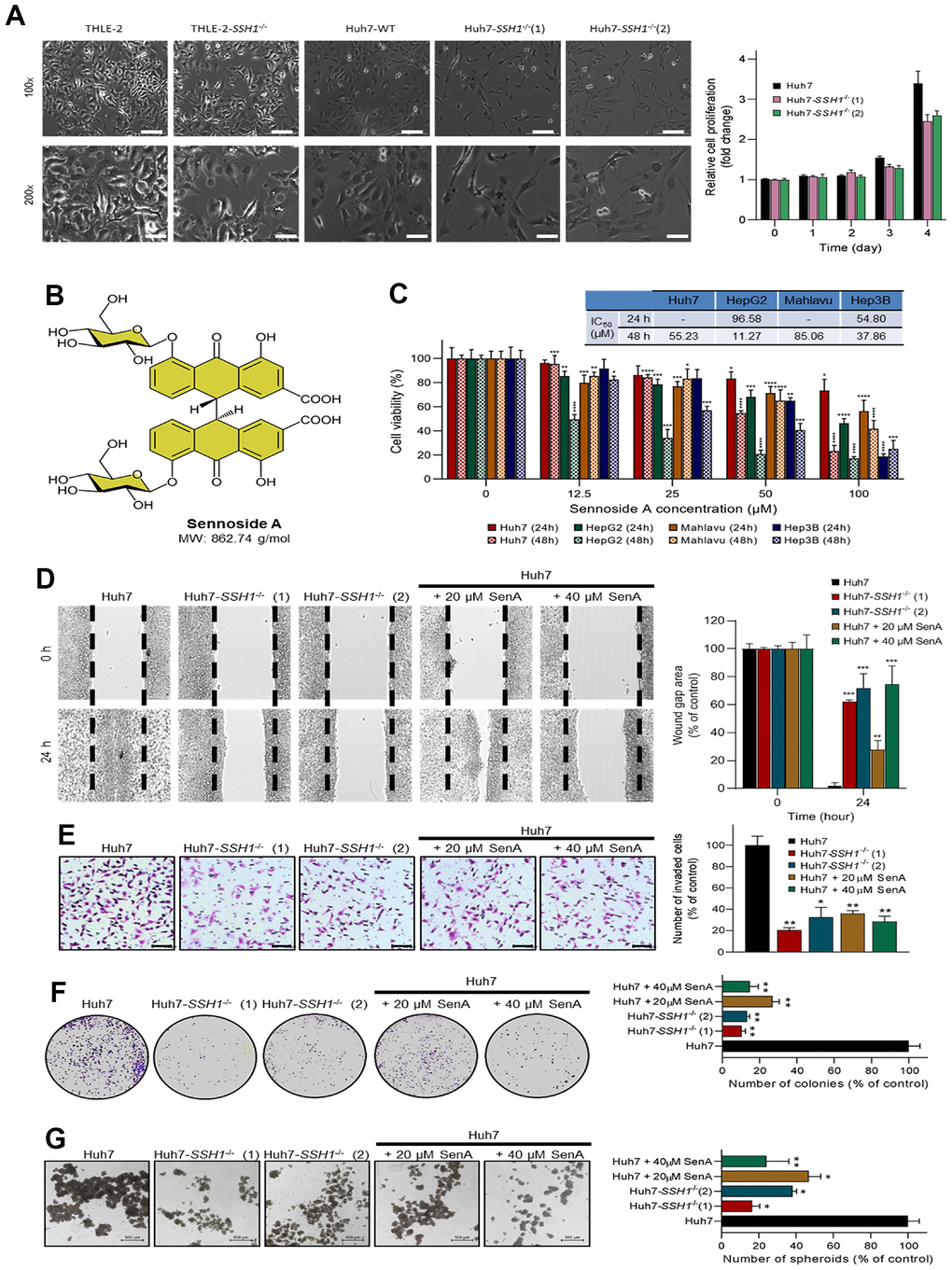 Furthermore, we used the Cox proportional hazard model for the assessment of our TMU-SHH HCC cohort clinicopathological data including gender, age, TMN stage, presence of metastasis, and SSH1 expression, as shown in Table 1. While the results of our univariate analysis showed that TMN stage (HR = 16.939, p = 0.0068), metastasis (HR = 9.971, p = 0.0030), and SSH1 expression Q-score (HR = 9.854, p = 0.0006) were strongly associated with HCC - related deaths, multivariate analysis revealed that only high SSH1 protein expression level is an independent predictor of disease-related death (HR = 7.272, p = 0.0042) (Table 1). The cut-off of 350 was ascribed for differential expression of SSH1 based on the Q-score derived from the intensity and distribution of SSH1 staining in the clinical samples. To better understand the oncogenic role of SSH1 in HCC, we performed a loss-of-function assay using the CRISPR/Cas9 technique and found that compared to the wild-type Huh7 (Huh7-WT) cells, cells with knocked-out SSH1 gene (Huh7-SSH1-/- (1) and (2)) exhibited significantly reduced viability (Figure 3A, left) and proliferation over time, as expressed by a ~1.3-fold reduction in the proliferation of Huh7-SSH1-/- cells (p < 0.05) (Figure 3A, right). Interestingly, knocking out SSH1 had no apparent effect on the viability or proliferation of normal human liver left lobe epithelial cell line THLE-2 cells (Figure 3A). Next, we demonstrated that the natural dianthrone glycoside called sennoside A (SenA), a popular herbal laxative for constipation with molecular weight 862.74 g/mol (Figure 3B) is a small molecule inhibitor of SSH1 and that exposure to 0 - 100 μM SenA dose-dependently suppressed the viability of Huh7 (IC50 = 55.23 μM), HepG2 (IC50 = 11.27 μM), Mahlavu (IC50 = 85.06 μM), or Hep3B (IC50 = 37.86 μM) HCC cell lines (Figure 3C). Interestingly, we found that similar to SSH1-/-, 20 μM and 40 μM Sen A significantly suppressed the migration of Huh7 cells, and this was dose-dependent (Figure 3D). Consistent with the above, we also demonstrated that cell invasion and colony formation were strongly inhibited in the Huh7-SSH1-/- (1) and Huh7-SSH1-/- (2) cells, and even more so in the Huh7 cells treated with 20 μM and 40 μM Sen A (Figure 3E, 3F). In addition, we demonstrated that compared with the wild type Huh7 cells, tumorsphere formation capability was significantly suppressed in the Huh7-SSH1-/- (1) (5.56-fold, p < 0.05), Huh7-SSH1-/- (2) (2.56-fold, p < 0.05), 20 μM (2.17-fold, p < 0.05), and 40 μM (3.85-fold, p < 0.01) Sen A - treated Huh7 cells (Figure 3G).