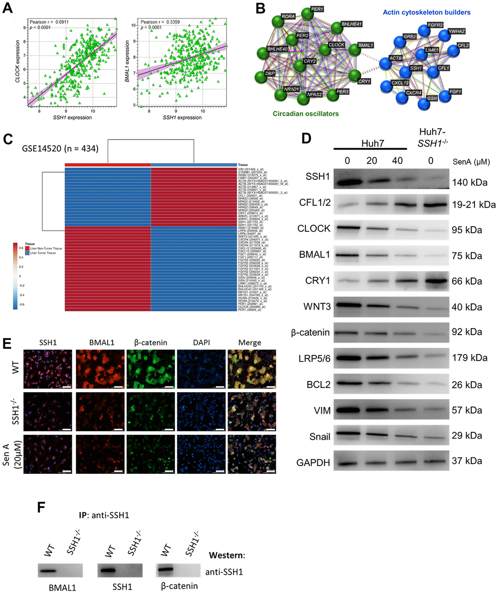 Against the background knowledge that cell-intrinsic actin dynamics is driven by the temporal coordination of actin regulators, and that this plays a critical role in the efficiency of actin-dependent processes such as the above-documented SSH1-related HCC aggression and progression, we probed for likely association between SSH1 expression and circadian rhythm modulators. We demonstrated a moderate to strong positive correlation between SSH1 and CLOCK (Pearson r = 0.69, p < 0.0001), or BMAL1 (Pearson r = 0.34, p < 0.0001) mRNA expression levels (Figure 4A). Using the STRING database (https://string-db.org) for visualization, we found that SSH1 interacts with actin cytoskeleton proteins, including CFL1, CFL2, Actin Beta (ACTB), Actin-Depolymerizing Factor/Gelsolin (GSN), LIM Domain Kinase 1 (LIMK1), Growth Factor Receptor Bound Protein 2 (GRB2), and forms a cascade with circadian oscillators, namely CLOCK, BMAL1, CRY1, CRY2, Period Circadian Regulator (PER)1/2/3, RAR Related Orphan Receptor A (RORA), and Basic Helix-Loop-Helix Family Member (BHLHE)40/41 (Figure 4B). In concordance, analysis of the GSE14520 HCC dataset (n = 434) found that while the median expression of SSH1, ARNTL/BMAL1, ACTB, LIMK1, GRB2, CTNNB1/β-catenin, and VIM were upregulated, CXCR4, CXCL12, GSN, BHLHE40, BHLHE41 and RORA were downregulated in liver tumor tissues (Figure 4C). Furthermore, we demonstrated that similar to the protein expression profiles elicited in the Huh7-SSH1-/- cells, treatment with 20 μM and 40 μM Sen A elicited significant dose-dependent suppression of SSH1, CLOCK, BMAL1, WNT3, β-catenin, LRP5/6, BCL2, VIM and Snail, with concomitant upregulation of CFL1/2, and CRY1 proteins expression levels (Figure 4D). We also showed the colocalization and significantly co-reduced protein expression of cytomembrane SSH1, BMAL1, and β-catenin in the Huh7-SSH1-/- cells, and upon exposure to 20 μM SenA (Figure 4E). In addition, based on co-immunoprecipitation, we found that more than colocalization and coexpression, SSH1 directly binds with BMAL1 and β-catenin (Figure 4F). These data do indicate that the oncogenic activity of SSH1 is mediated by circadian rhythm disruption and Wnt/β-catenin signaling activation.