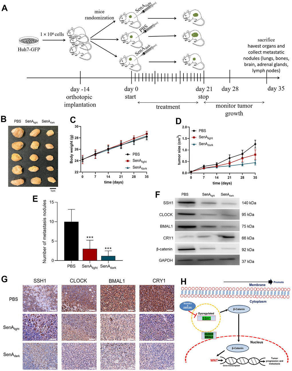 Having demonstrated that SSH1 expression and/or activity is associated with the disruption of circadian rhythm and activation of Wnt/β-catenin signaling in vitro, we next sought to see if this is replicated in vivo using NOD/SCID mice inoculated with 1 x 106 GFP-labeled Huh7 cells (Figure 5A). As shown by our in vivo data, compared with the PBS-treated control mice (PBS, n = 5), mice treated with 10 mg/kg/day SenA intraperitoneally at 9 am (SenAlight), or at 9 pm (SenAdark) for 21 days elicited dramatically reduction in tumor burden, respectively by day 35 (Figure 5B). Similarly, significantly reduced tumor volume was observed in the mice treated with SenAlight (1.76-fold, p < 0.01) and SenAdark (3.79-fold, p < 0.01) (Figure 5C). No apparent difference was observed between the body weights of mice from the PBS control, SenAlight, or SenAdark group (Figure 5D). Furthermore, we found that the SenAdark mice exhibited the least intrahepatic and lung metastasis, compared with the SenAlight and PBS-treated groups (Figure 5E). Also, using cells dissociated from tumors extracted from the mice, in comparison to the PBS-treated group, the expression of SSH1, CLOCK, BMAL1 and β-catenin proteins were significantly downregulated in the SenAlight and SenAdark mice; this was more so in the SenAdark mice (Figure 5F). Conversely, compared with the PBS control and SenAlight mice, CRY1 protein expression was upregulated in the SenAdark mice (Figure 5F). Consistent with the western blot results, we demonstrated that the circadian nature of the tumors in PBS, SenAlight and SenAdark mice maintained under specified light/dark conditions, with SSH1-mediated reduced immunoreactivity of SSH1, CLOCK, BMAL1, and CRY1 in tumors from the SenAlight and SenAdark (Figure 5G). These data indicate that the oncogenic activity of SSH1 has a circadian rhythm molecular underlining and that this can be exploited for therapeutic benefit of patients with HCC (depicted in Figure 5H).