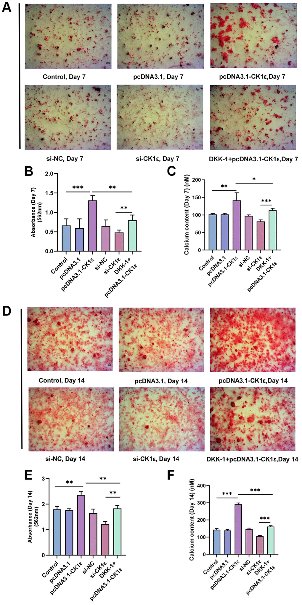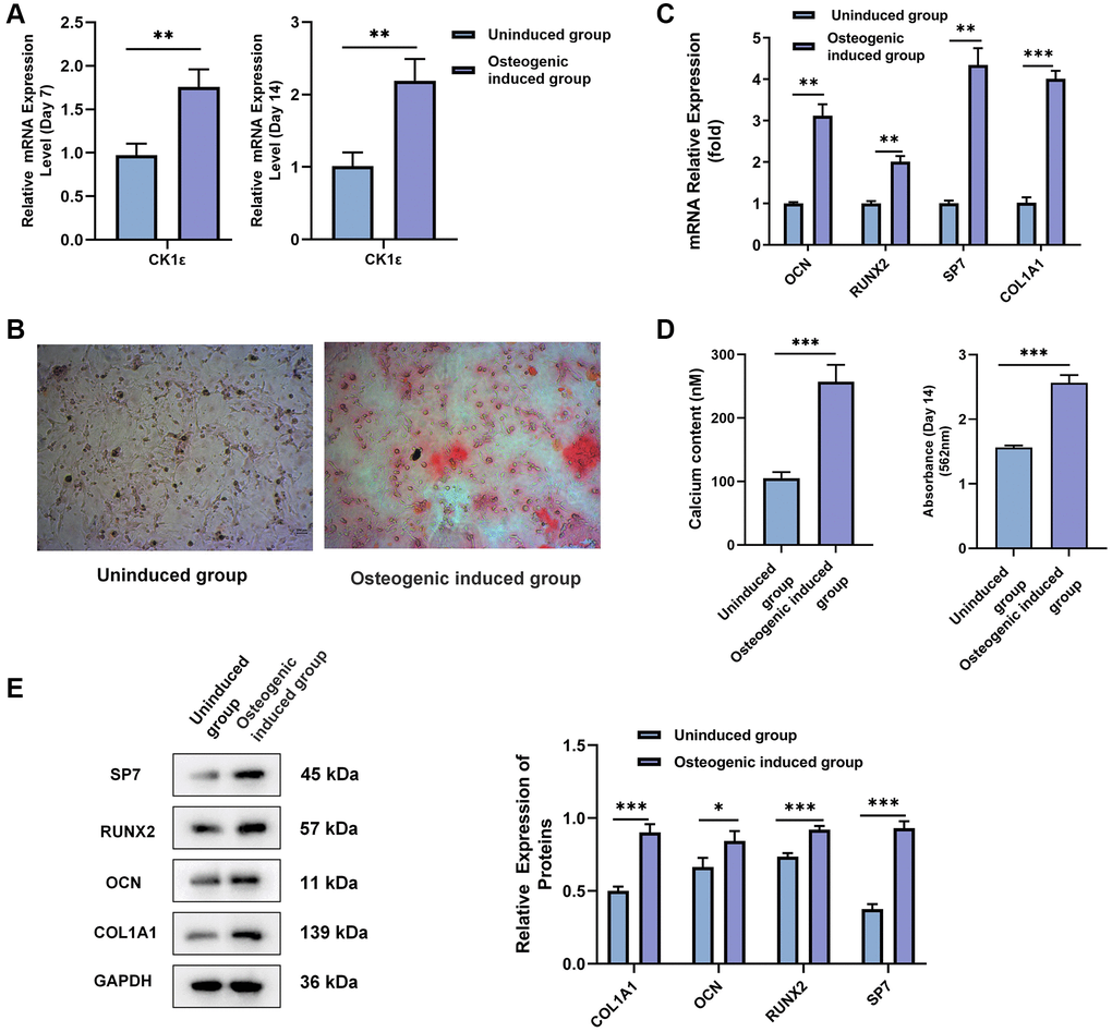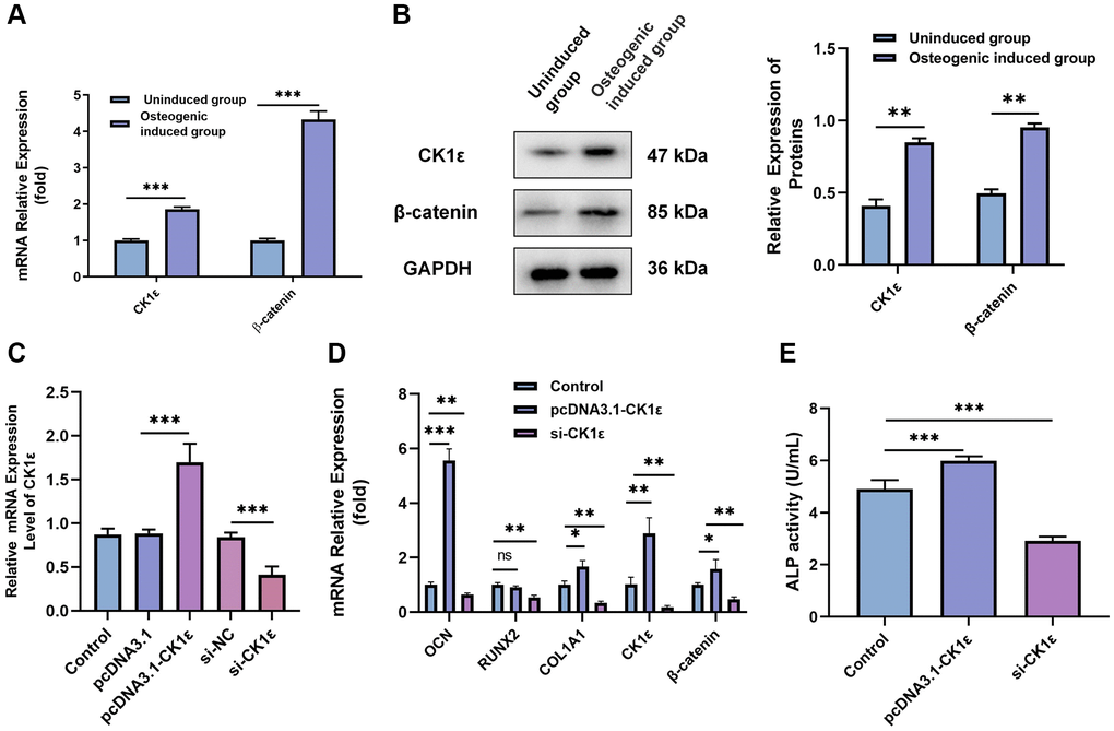 Routine OD induction culture procedure: BMSCs were grown in DMEM/F12 containing 10% FBS, 50 ug/mL of streptomycin, and 100 U/mL of penicillin at 37°C and 5% CO2 until reaching 70–80% cell confluence. Then, the initial culture medium was removed, and an osteogenic induction culture medium (OIM, RAXMX-90021, Cyagen, Taicang, China. Ingredients: OriCell®Basal medium for cell culture, 177 mL; OriCell®Fetal bovine serum (Superior-Quality), 20 mL; OriCell®Supplement for rat bone marrow mesenchymal stem cells OD, 3 mL; alizarin red stain, 10 mL; Gelatin, 10 mL) was added. Si-NC (20 nM), CK1ε siRNAs (20 nM), pcDNA3.1 (2 μg/mL), and pcDNA3.1-CK1ε (2 μg/mL) were purchased from Tsingke Biotechnology Co., Ltd. (Beijing, China). Due to the time of osteogenic induction and the aging of transfection, OD induction was initiated 24 hours after transfection, and transfection was performed again on the 5th and 10th day, respectively, to maintain the efficiency of transfection. The proliferation efficiency and morphology of BMSCs did not change significantly after the first transfection. 24 h after transfection, OD culture began. At this time, the proliferation efficiency of BMSCs began to decline, and the morphology of some cells gradually changed from spindle to polygon. After the second and third transfection and OD induction culture, the cell proliferation efficiency was further reduced, and the cell morphology was completely polygon. 7 days later, nodular structures gradually began to appear in the cultured cells. In addition, DKK-1 (Wnt inhibitor; MCE, Monmouth Junction, NJ, USA) at a concentration of 0.5 μg/mL and pcDNA3.1-CK1ε were co-transfected to verify the interaction between CK1ε and Wnt/β-catenin. Transfections were carried out using lipofectamine 2000 (Invitrogen, Waltham, MA, USA) [29]. IWP-O1 (DVL2 phosphorylation inhibitor, MCE) at a concentration of 1 uM was co-cultured to explore the specific relationship between CK1ε and DVL2.
