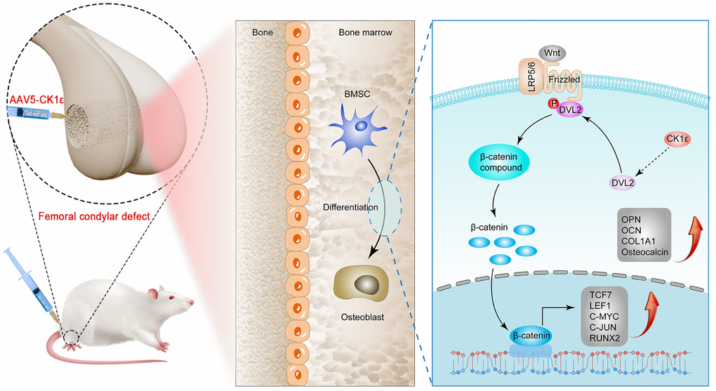 In summary, our results suggest that CK1ε can promote the OD of BMSCs by activating DVL2 phosphorylation and promoting β-catenin nuclear transfer, thus activating the β-catenin/Wnt signaling pathway. CK1ε may be a potential agent of choice for promoting bone defect healing. Overall, the importance of these findings is that they provide a potential strategy for treating bone defects and promoting bone regeneration.
