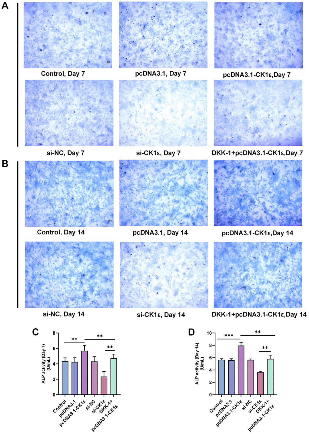 Then, we examined the mineralization of different groups. The cells were allowed to grow for two weeks and related events were observed every seven days. Consistent with our hypothesis, the up-regulation of CK1ε significantly increased the calcification state of cells compared to groups with lower or normal expression of CK1ε. The pcDNA3.1-CK1ε group demonstrated the most obvious staining changes on both day 7 and 14, when compared with other groups (Figure 3A, 3D). The results of the ARS qualitative analysis and intracellular calcium concentration confirmed the beneficial role of CK1ε overexpression in promoting OD, and the inhibition effect of low CK1ε expression on OD (Figure 3B, 3C, 3E, 3F, P < 0.01). Next, to further study the exact relationship between CK1ε and Wnt/β-catenin, DKK-1 (a Wnt/β-catenin signal pathway inhibitor) was used to interfere with the BMSCs during the whole process of induction. After seven days of incubation, ARS showed reduced calcification levels in the DKK-1+pcDNA3.1-CK1ε group compared with the pcDNA3.1-CK1ε group, which means that blocking the Wnt/β-catenin pathway significantly reduced the level of calcification (Figure 3A–3C, P < 0.01). Moreover, the results were more obvious on the 14th day (Figure 3D–3F, P < 0.01). Then, we estimated the ALP activity in all the groups. Combined with ALP staining and the activity results, we found that overexpression of CK1ε significantly increased the activity of ALP, while low expression of CK1ε decreased the activity of ALP. Meanwhile, DKK-1 could also reverse the increased ALP activity caused by CK1ε overexpression (Figure 4, P < 0.01).
