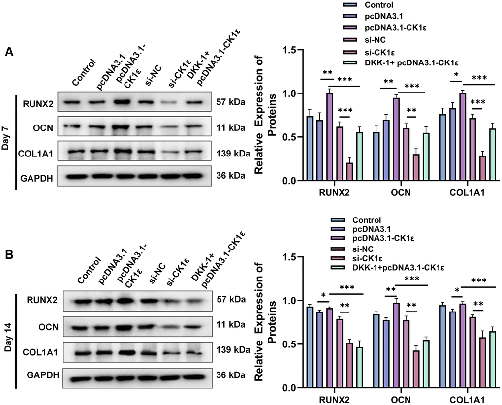 We further verified the results of osteoblast-related protein expression between the different groups. At day 7, pcDNA3.1-CK1ε significantly increased the relative protein expression levels of the OD markers (RUNX2, OCN, and COL1A1) compared with the control group and the si-CK1ε group, while this trend was reversed by DKK-1 (Figure 5A). However, on day 14, the effect of DKK-1 on the OD marker protein still continued, while pcDNA3.1-CK1ε was weaker than that on day 7 (Figure 5B). We analyzed that the reason might be because at day 14, most of the BMSCs had completed OD. Moreover, similar results were observed in the mineralization assay and expression detection of marker proteins of osteogenic differentiation when DKK-1+pcDNA3.1-CK1ε group was compared with pcDNA3.1-CK1ε and si-CK1ε group. pcDNA3.1-CK1ε promotes osteogenic differentiation of BMSCs and is blocked by DKK-1, but this effect is weaker than that of si-CK1ε. The above results showed that transfection with pcDNA3.1-CK1ε promoted the OD of BMSCs, and the addition of DKK-1 significantly prevented the OD caused by CK1ε overexpression. CK1ε plays an important role in the Wnt signaling pathway. These results together indicated that the up-regulation of CK1ε could increase the OD of BMSCs by activating the Wnt/β-catenin pathway, considering that DKK-1 is an inhibitor of the Wnt signaling pathway co-receptor LRP5/6 [45]. Our results suggested that the target of CK1ε may be at the Wnt signaling pathway LRP5/6 receptor or at further downstream sites.