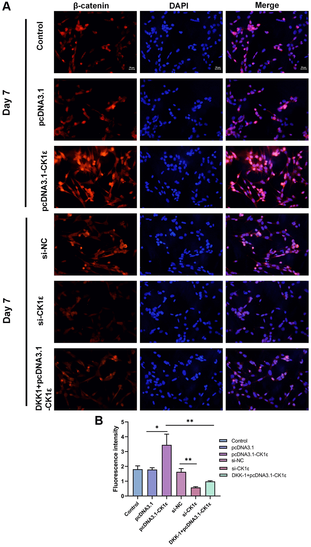 In order to further explore the relationship between CK1ε and Wnt signaling pathway, we conducted follow-up experiments. The stimulation of the Wnt/β-catenin pathway by CK1ε was further observed by immunofluorescence staining on the seventh day after induction, and the results showed that CK1ε promoted the expression of β-catenin. Figure 6 shows the fluorescence microscope images and relative fluorescence intensity analysis of BMSCs in the different groups on day 7. Immunofluorescence staining showed that the expression of β-catenin in the nucleus of the si-CK1ε group was significantly lower than in the si-NC group. However, compared to the control group and the pcDNA3.1 group, BMSCs in the pcDNA3.1-CK1ε group showed higher relative β-catenin expression, suggesting that CK1ε up-regulation may promote OD by directly enhancing β-catenin expression. Next, the β-catenin inhibitor DKK-1 was added to the pcDNA3.1-CK1ε group to verify whether CK1ε gene overexpression could activate the Wnt/β-catenin pathway and increase the expression of β-catenin. After the DKK-1 intervention, the expression of β-catenin was decreased compared to the pcDNA3.1-CK1ε-transfected group, which indirectly confirmed that the up-regulation of CK1ε promoted the expression of β-catenin in BMSCs (Figure 6A, 6B). Based on the above results, we believed that the target of CK1ε may be located between the LRP5/6 receptor and β-catenin.