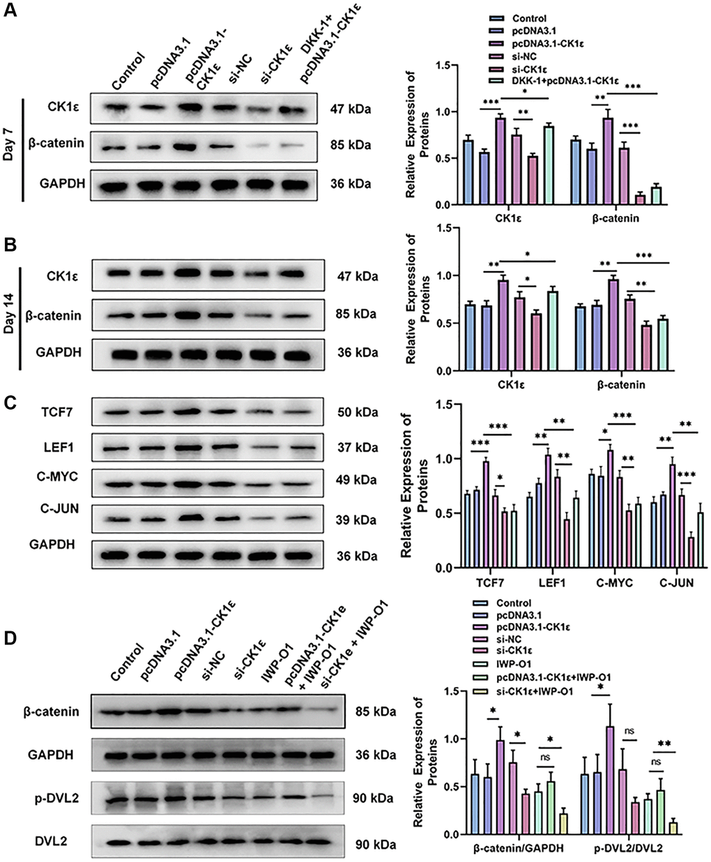 We further verified the relative protein expression of CK1ε and β-catenin on day 7 and 14 after BMSC osteogenic induction by Western blots. At the same time, the relative protein expression changes of C-JUN, C-MYC, LEF1, and TCF7 in the downstream of Wnt/β-catenin pathway at day 14 were also verified. Figure 7A, 7B show that pcDNA3.1-CK1ε significantly increased the relative protein expression of CK1ε and β-catenin, while DKK-1 also inhibited the relative protein expression of β-catenin, but had little effect on CK1ε. However, the inhibition of β-catenin by DKK-1 was stronger than that by si-CK1ε, and the inhibition decreased at 14 days. Meanwhile, the downstream proteins of Wnt, including C-JUN, C-MYC, LEF1, and TCF7 [19, 46], showed similar changes to β-catenin (Figure 7C, P < 0.05). These results further demonstrate that CK1ε can activate the Wnt/β-catenin pathway when overexpressed, and its target location is upstream of β-catenin. By competitively binding to the LRP5/6 receptor, DKK-1 blocks the down transmission of the Wnt signal and reduces the Wnt signal entering the cytoplasm normally, which may be the reason why the expression of intracellular CK1ε itself is not inhibited. To explore the relationship between CK1ε and specific targets in the upstream region of the Wnt/β-catenin signaling pathway, we introduced the DVL protein inhibitor IWP-O1 (MCE, USA). IWP-O1 can specifically inhibit Dvl2 phosphorylation in cells [47]. Our results showed that IWP-O1 could inhibit the expression of β-catenin and also lowered the increases in β-catenin induced by pcDNA3.1-CK1ε. When IWP-O1 synergistically interacted with si-CK1ε, the inhibitory effect of si-CK1ε on the Wnt pathway was enhanced (Figure 7D, P < 0.05). The previous experimental results combined with the competitive binding effect of DDK-1 on low-density lipoprotein receptor-related protein (LRP) and the direct effect of DVL blocker, suggested that CK1ε may activate the Wnt/β-catenin pathway through direct interaction with DVL2 and activation of DVL2 phosphorylation.