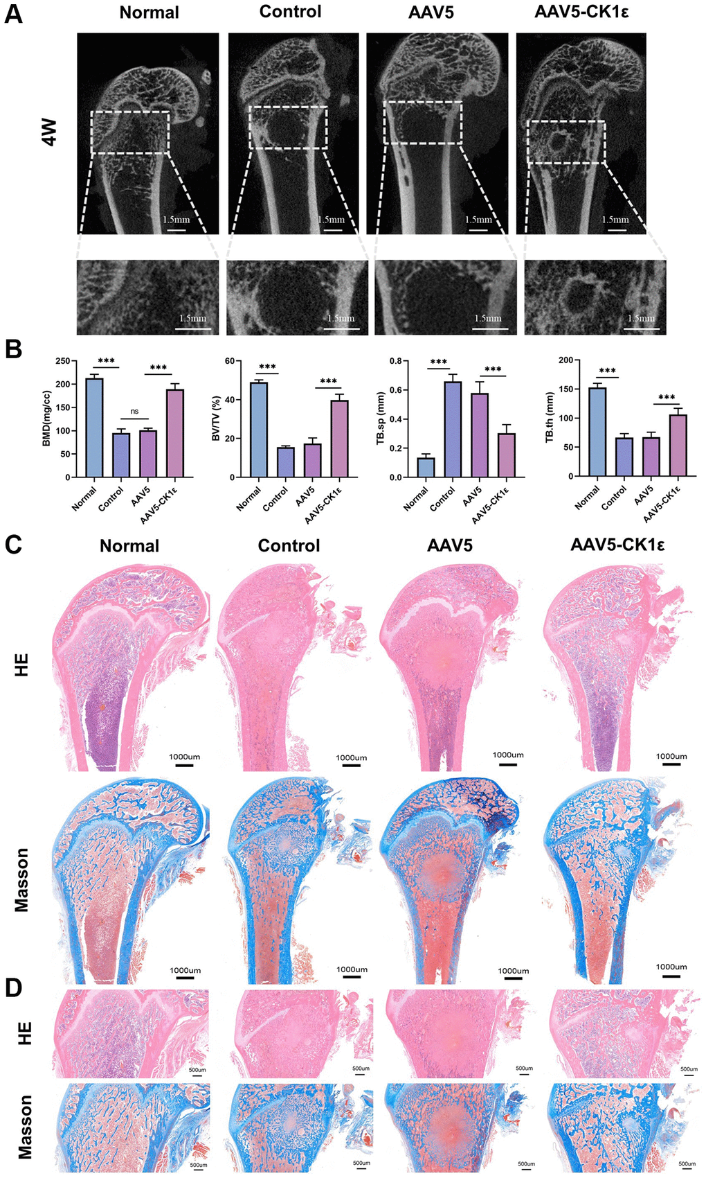 We obtained sagittal sections from the specimens collected at 4 weeks and performed H&E and Masson staining to analyze the effect of femoral condyle repair. Figure 8B shows the complete sagittal plane of the femur, and Figure 8C is a partial enlargement. From the gross images of H&E staining, we found that the bone tissue density in the AAV5-CK1ε and normal groups was significantly higher than that in the control and AAV5 groups, and that the AAV5-CK1ε group had the highest levels four weeks after surgery. Meanwhile, in both the control group and the AAV5 group, there were still traces of holes left over from the healing process (Figure 8C, 8D). Masson staining showed that in the original bone defect area of the AAV5-CK1ε group, there was obvious blue staining tissue infiltration, indicating collagen formation, and red staining with the surrounding collagen gradually tending to form normal cancellous bone tissue. It showed a good ability to promote OD. The H&E and Masson images of the AAV5-CK1ε group at 4 weeks showed that the bone defect had basically healed, and the cancellous bone area was no longer significantly different from normal bone tissue, suggesting that AAV5-CK1ε promoted bone defect healing (Figure 8C, 8D).