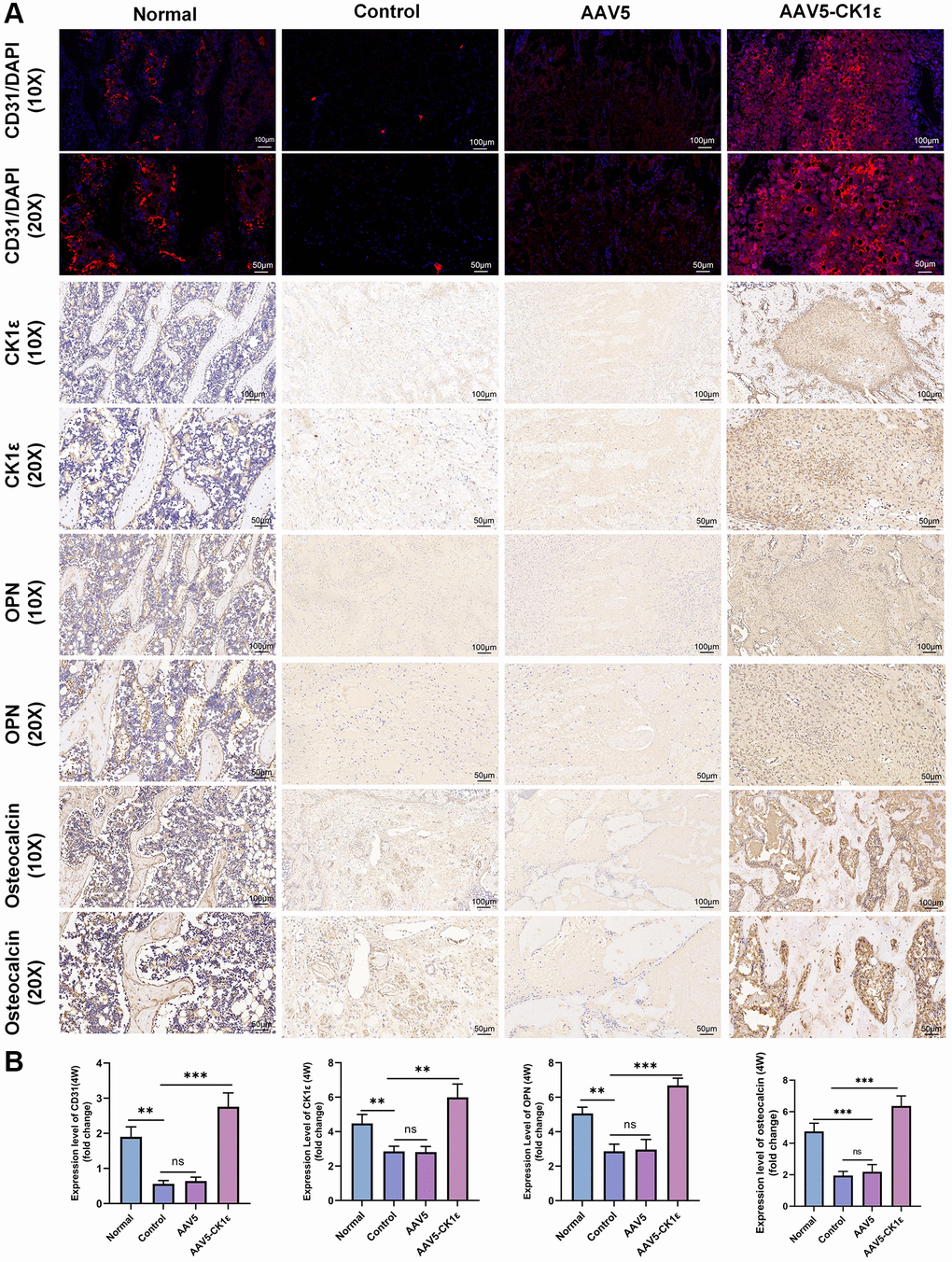 The early angiogenesis and maturation of vascular sprouting are important driving factors for tissue repair. CD31, also known as a platelet-endothelial cell adhesion molecule, is an important indicator of angiogenesis. In this study, four weeks after injury, the CD31 signal in the AAV5-CK1ε group and the normal group was significantly stronger than that in the control group and the AAV5 group (Figure 9A). The quantitative analysis of CD31 expression was consistent with the immunofluorescence images (Figure 9B, P < 0.01). These results confirmed the mechanism of AAV5-CK1ε in promoting angiogenesis at the molecular level. In vivo, CK1ε has been shown to promote local angiogenesis, possibly through the Wnt/β-catenin signaling pathway. These results provide a good basis for understanding long-term bone tissue repair.
