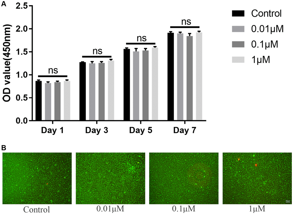 The harvested BMMs were seeded into 96-well plate at the same density of about 5 × 103 cells/well with 30 ng/mL and cultured for 24 hours. Initially, the BMMs were cultured with higher dose of ICT (1, 5, 10, 20, and 40 μM) for 3 days to determine the IC50 of ICT on BMMs. Then, the BMMs were treated with vehicle (DMSO) and lower dose of ICT (0.01, 0.1, and 1 μM) for 1 day, 3 days, 5 days, and 7 days. The absorbance of 450 nm was measured by FlexStation 3 (Molecular Device, Shanghai, China) according to instruction manual of CCK-8 kit. In addition, the BMMs cultured for 7 days were subjected to LIVE/DEAD assay via protocol of LIVE/DEAD Cell Imaging Kit (R37601) (Thermo Fisher Scientific, Waltham, MA, USA). Briefly, the component A was mixed component B to create working solution, which was further added to plate for 15 mins incubation at darkroom. The live and dead cells were showed green fluorescence and red fluorescence respectively.