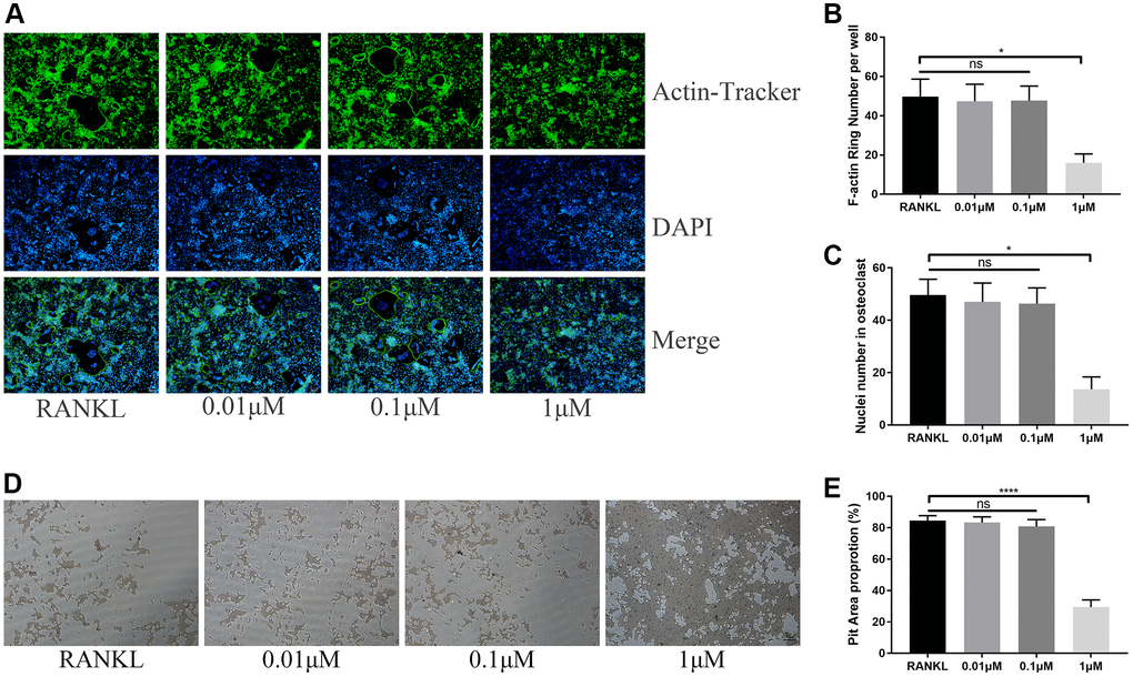 The harvested BMMs were seeded into Corning Osteo Assay Surface plate (Corning Incorporated Life Science, Corning, NY, USA) at the same density about 2 × 104 cells/well with 30 ng/mL and cultured for 24 hours. After that, the BMMs were cultured in osteoclastogenic medium mentioned above. When the formed osteoclasts were observed, cells were fixed with 4% paraformaldehyde (PFA) for 20 mins and permeabilized with 0.1% (v/v) Triton X-100 for 5 mins. After that, we used Actin-Tracker and DAPI to label F-actin and nucleus respectively. The images of F-actin ring were acquired by Olympus IX-71 (Olympus, Tokyo, Japan).