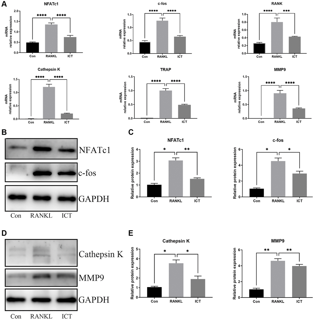 For further investigating the expression of osteoclast-specific genes during osteoclast differentiation, the BMMs were cultured in osteoclastogenic medium with DMSO or ICT (1 μM) for 3 days. The specific genes responsible for osteoclast formation and osteoclastic bone resorption activity were selected, including NFATc1, c-fos, RANK, Cathepsin K, MMP9, and TRAP, and the normalized data revealed that ICT markedly attenuated RANKL-stimulated expression of NFATc1, c-fos, RANK, Cathepsin K, MMP9, and TRAP (Figure 4A). In western blot assay, the data demonstrated that the protein expression of NFATc1, c-fos, MMP9, and Cathepsin K were also reduced compared with RANKL stimulation, which is in line with the mRNA results (Figure 4B–4E).