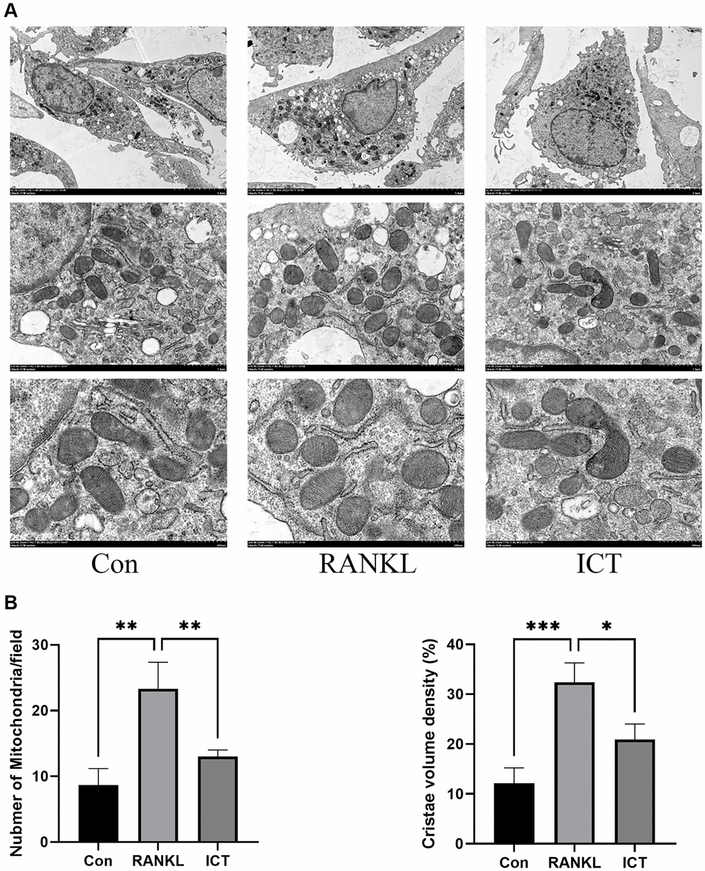 The harvested BMMs were seeded into 6-well plates at the same density about 2.5 × 103 cells/cm2 with M-CSF (30 ng/mL) and cultured for 24 hours. Then, the BMMs were cultured in osteoclastogenic medium with vehicle (DMSO) or ICT (1 μM). Three days later, cells were fixed with 2.5% glutaraldehyde, postfixed with 1% osmium tetroxide, dehydrated in a graded series of ethanol, and embedded in resin. Next, the embedded samples were cut into 60 nm sections by an ultramicrotome (Leica EM UC7). After being stained with uranyl acetate and lead citrate, the sections were finally observed at TEM (HT7800/HT7700, HITACHI).