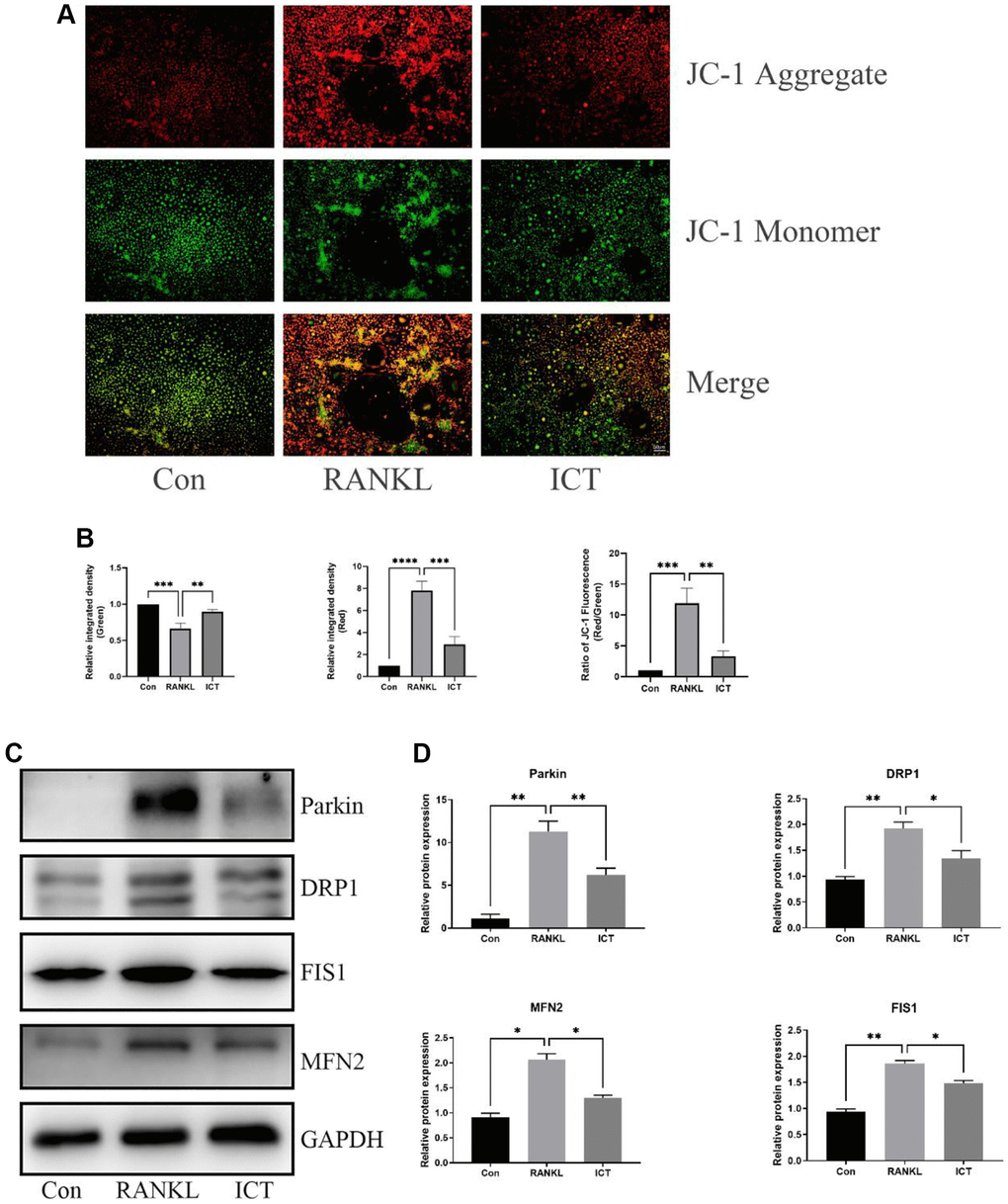 The harvested BMMs were seeded into 6-well plates at the same density about 2.5 × 103 cells/cm2 with M-CSF (30 ng/mL) and cultured for 24 hours. Then, the BMMs were cultured in osteoclastogenic medium with vehicle (DMSO) or ICT (1 μM). Three days later, the JC-1 staining solution (No. 10009172) (Cayman Chemical, Ann Arbor, MI, USA) were added at rate of 100 μl per ml. After incubated in CO2 incubator at 37°C for 20 mins, the mitochondrial membrane potential was detected by fluorescence microscope.