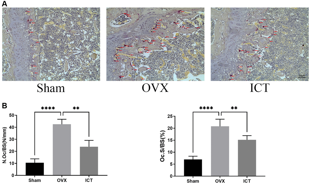 In our vitro study, we demonstrated that ICT administration could regulate osteoclast differentiation and osteoclastic bone resorption activity, thus we wanted to further investigate the potential therapeutic effect of ICT on osteoporosis through in vivo study. Through scanning the femur samples, the dramatic compromised trabecular bone mass was observed in OVX group, which was featured with decreased BV/TV, Tb.N, and elevated Tb.Sp, and ICT treatment reversed the bone loss induced by estrogen deficiency (Figure 7A, 7B). In the bone section, the results of TRAP staining indicated that the number of osteoclasts normalized to the bone surface (N.Oc/BS), and surface area of osteoclast to bone surface area (OcS/BS) were increased in distal femur and the osteoclast formation in vivo was inhibited when OVX mice were administrated with ICT (Figure 8A, 8B). According to the data from in vivo study, we concluded ICT ameliorates OVX-induced bone loss via inhibiting osteoclasts formation.