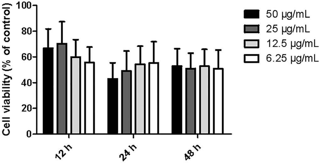 The proliferative activities in different dosage group (6.25, 12.5, 25, and 50 μg/ml) displayed an upward-downward-upward trend after 12, 24, and 48 hours of treatment with ginkgolide, respectively. Cell viability at 12 hours post-treatment was remarkably higher than that at 24 hours or 48 hours post-treatment. Furthermore, at 12 hours post-treatment, the cell viability at 25 μg/ml was remarkably increased compared with that of the other dosage groups (P < 0.01 and P < 0.01) (Figure 1). Based on these findings, 25 μg/ml and 12 hours post-treatment were selected as the optimal concentration and time point for cell proliferation, respectively.