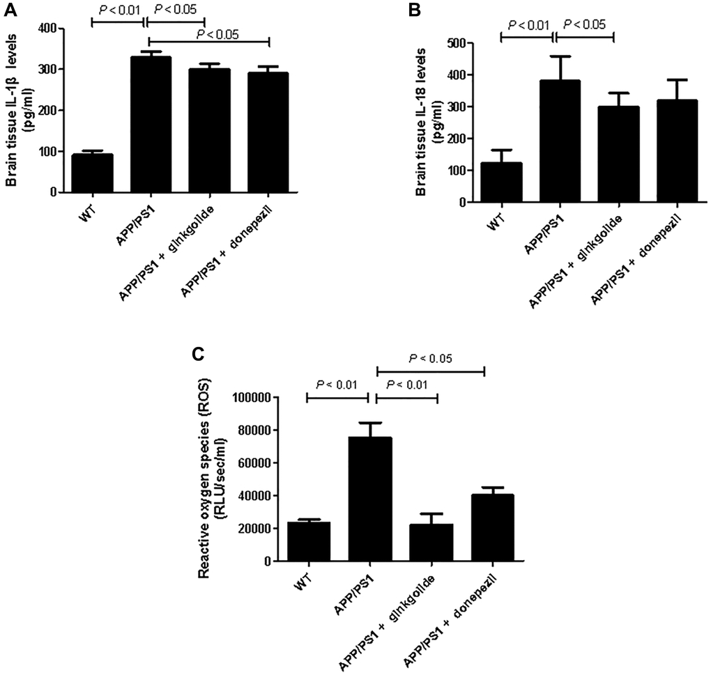 To evaluate whether ginkgolide could reduce pro-inflammatory cytokines in the brains of APP/PS1 mice, we measured brain IL-1β and IL-18 protein levels. As shown in Figure 10, levels of IL-1β (Figure 10A) and IL-18 (Figure 10B) were significantly elevated in the cortex and hippocampus of the APP/PS1 group as compared to those in the WT group (P < 0.01 and P < 0.01). Relative to the APP/PS1 group, ginkgolide treatment significantly reduced IL-1β and IL-18 (P < 0.05 and P < 0.05), and donepezil decreased only IL-1β levels in the mice brain (P < 0.05). When compared to APP/PS1 group, ROS levels in the brain tissue of ginkgolide-treated or donepezil-treated mice were almost consistent with this group’s qRT-PCR and western blotting results (Figure 10C, P < 0.01 and P < 0.05).