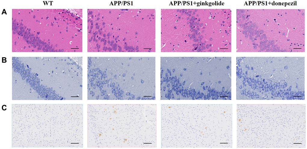 H&E and Nissl staining displayed greater inflammatory cell infiltration and neuron loss in the hippocampi and cerebral cortex of vehicle-treated APP/PS1 mice than in those of vehicle-treated WT mice and a reduction thereof with ginkgolide or donepezil administration (Figure 7A, 7B). Immunohistochemistry showed that vehicle-treated APP/PS1 mice had an over-accumulation of brain Aβ plaques, whereas these plaques were reduced in ginkgolide- and donepezil-treated AD mice (Figure 7C).
