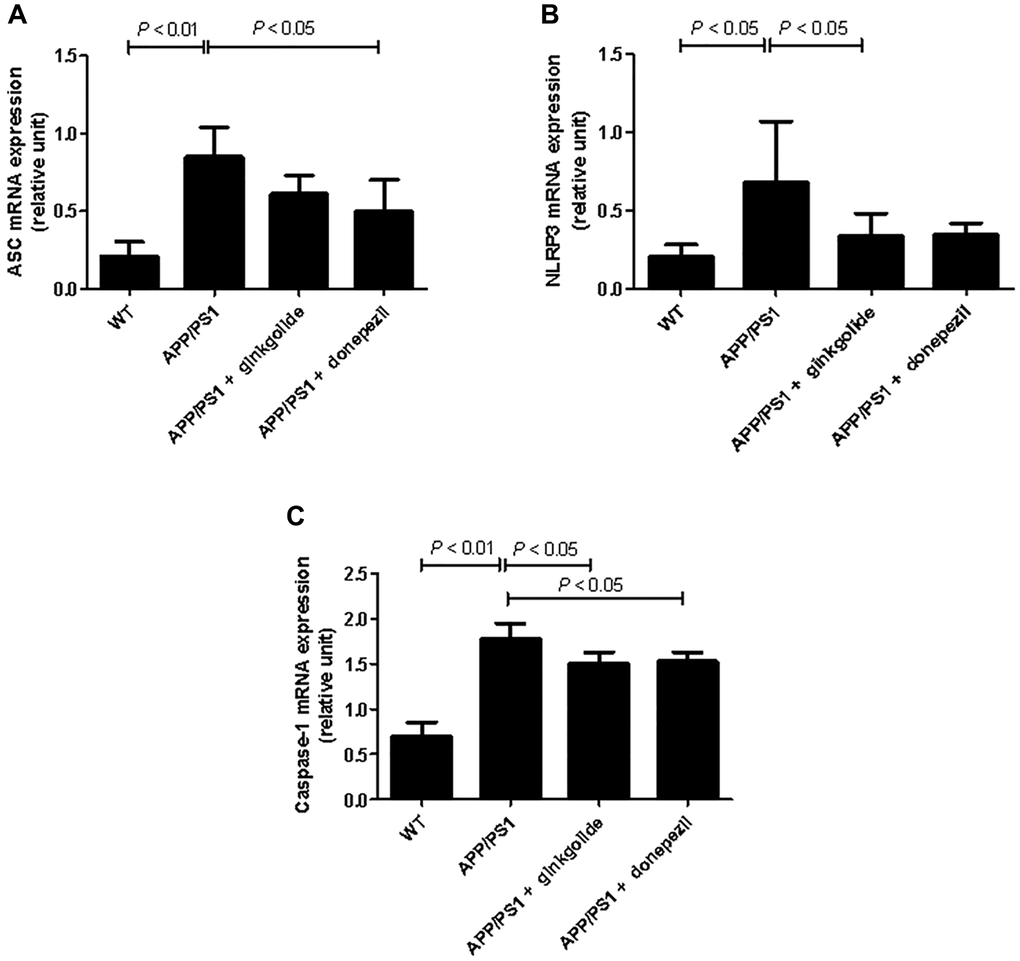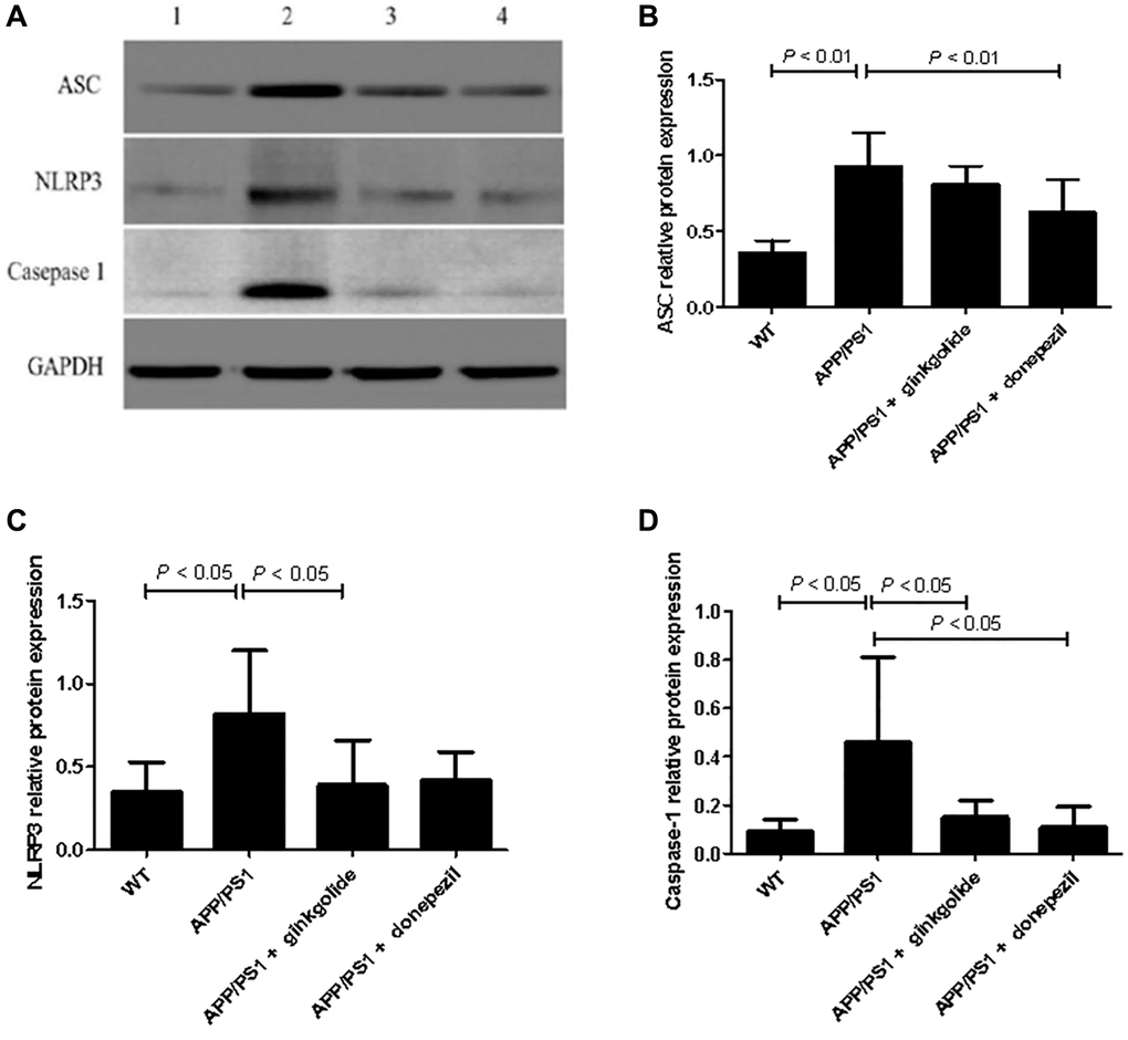 The mRNA and protein expression levels of NLRP3 inflammasome pathway molecules were detected in brain tissue using quantitative real-time PCR (Figure 8) and western blotting (Figure 9). As a result, relative to the WT group, the mRNA and protein levels of ASC, NLRP3, and caspase-1 increased in the hippocampal tissue of APP/PS1 group (mRNA: P < 0.01, P < 0.05, and P < 0.01; protein: P < 0.01, P < 0.05, and P < 0.05), but the mRNA and protein levels of NLRP3 were reduced in ginkgolide-treated group when compared to APP/PS1 group (P < 0.05 and P < 0.05). Moreover, expression levels of ASC and caspase-1 were lower in donepezil-treated group than those in APP/PS1 group (P < 0.05 and P < 0.05, P < 0.05 and P < 0.05).