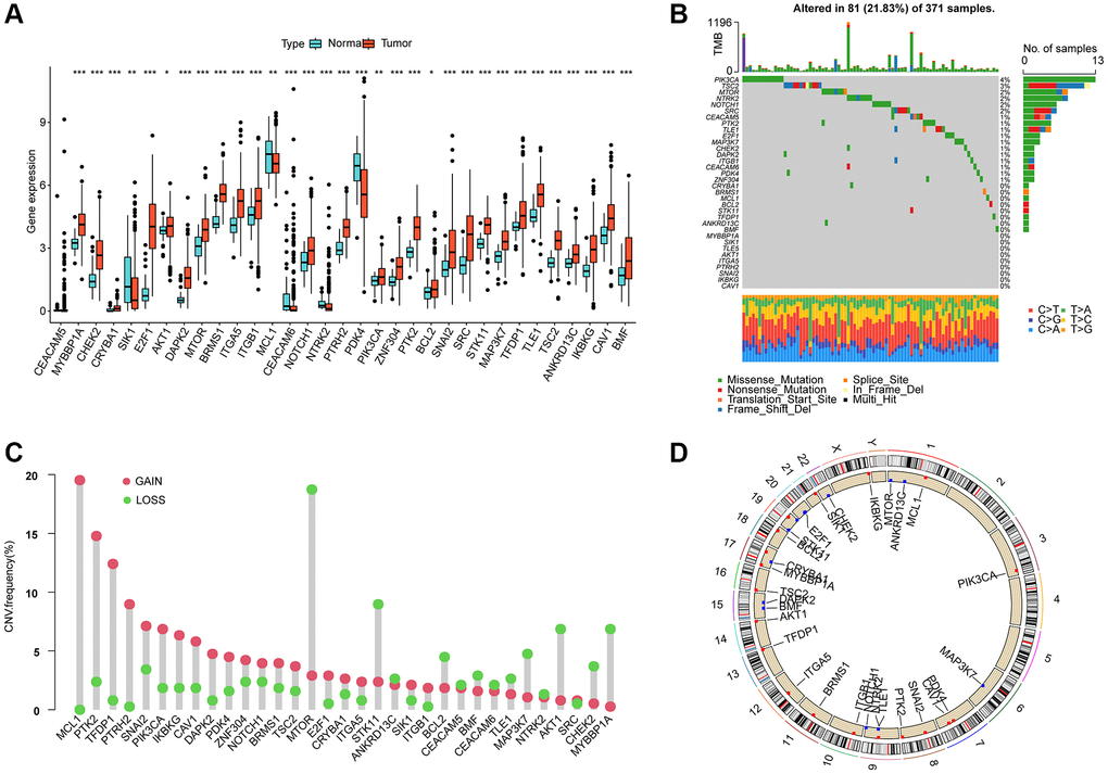 In this study, a total of 33 ARGs were collected from the MSigDB database, and their potential role in HCC was investigated. To evaluate their expression profiles in normal and HCC tissues, we used “limma” script and conducted differential expression analysis. The results revealed that 32 ARGs were significantly differentially expressed in normal and HCC tissues (Figure 1A, p < 0.05). Furthermore, the somatic mutation waterfall plot displayed the mutation frequency of ARGs in HCC, and the analysis indicated that PIK3CA, TSC2, MTOR, SRC, NOTCH1, and NTRK2 had mutation frequencies of 4%, 3%, 2%, 2%, 2%, and 2%, respectively (Figure 1B). Additionally, the copy number analysis of ARGs in HCC showed significant amplification of most ARGs, such as MCL1, PTK2, TFDP1, PTRH2, SNAI2, and PIK3CA, while several genes including MTOR, STK11, BCL2, MAP3K7, AKT1, CHEK2, and MYBBP1A were significantly missing (Figure 1C). Moreover, we also explored the chromosomal location of the 33 ARGs (Figure 1D). The findings suggest substantial differences in ARG expression, mutation, and copy number variation in HCC, thus highlighting their potential role in HCC.