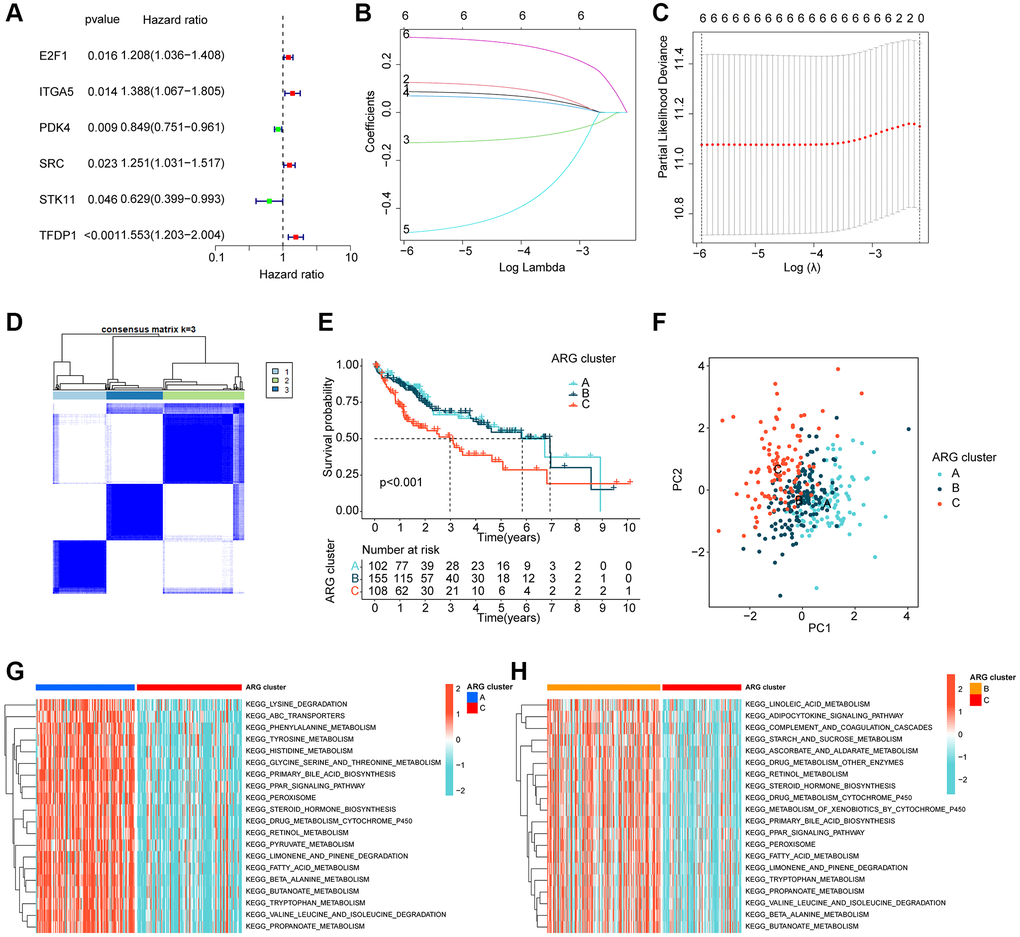 Using LASSO-univariate Cox analysis, we identified 6 ARGs that were associated with HCC prognosis, consisting of 4 risk factors (E2F1, ITGA5, SRC, TFDP1) and 2 favorable factors (PDK4, STK11) (Figure 2A–2C). Furthermore, multivariate Cox analysis was carried out to determine 3 independent prognostic factors that were associated with the clinical prognosis of HCC. To explore the potential relationship between ARGs and different molecular subtype characteristics of HCC, we conducted consensus cluster analysis based on the 3 independent prognostic factors of HCC, which demonstrated that HCC samples can be accurately classified into 3 different molecular subtypes when k = 3, with cluster A containing 102 HCC samples, cluster B containing 155 HCC samples, and cluster C containing 108 HCC samples (Figure 2D). It was observed that the clinical survival outcome of HCC in cluster C was significantly worse than that of cluster A and B, while the clinical survival outcome was similar between cluster A and cluster B (Figure 2E, p < 0.001). Moreover, unsupervised PCA plots displayed a significant variability among the 3 HCC molecular subgroups (Figure 2F). To further investigate the potential molecular mechanisms between the different ARG-based molecular subtypes, GSVA results illustrated that metabolism-related pathways were considerably downregulated in Cluster C compared to Cluster A and Cluster B, encompassing tyrosine metabolism, pyruvate metabolism, and fatty acid metabolism (Figure 2G, 2H).